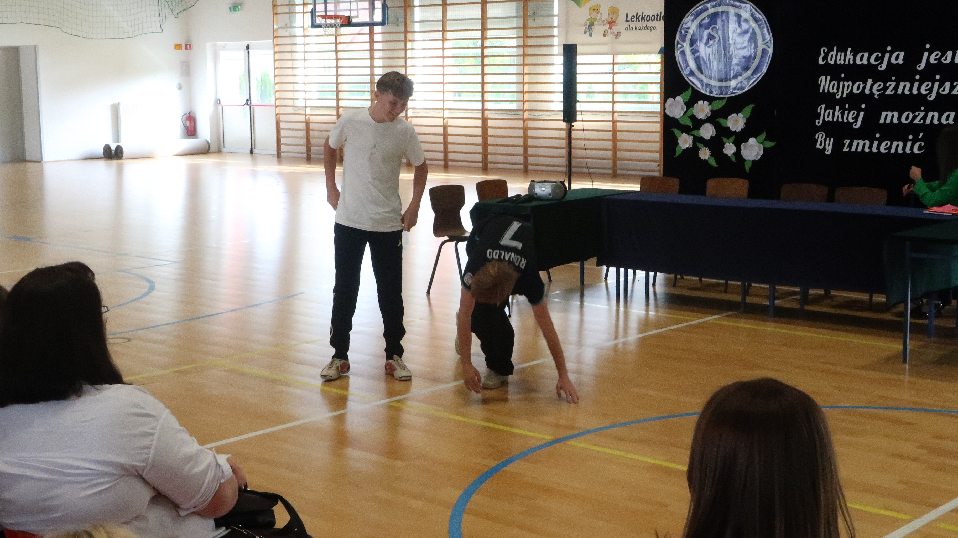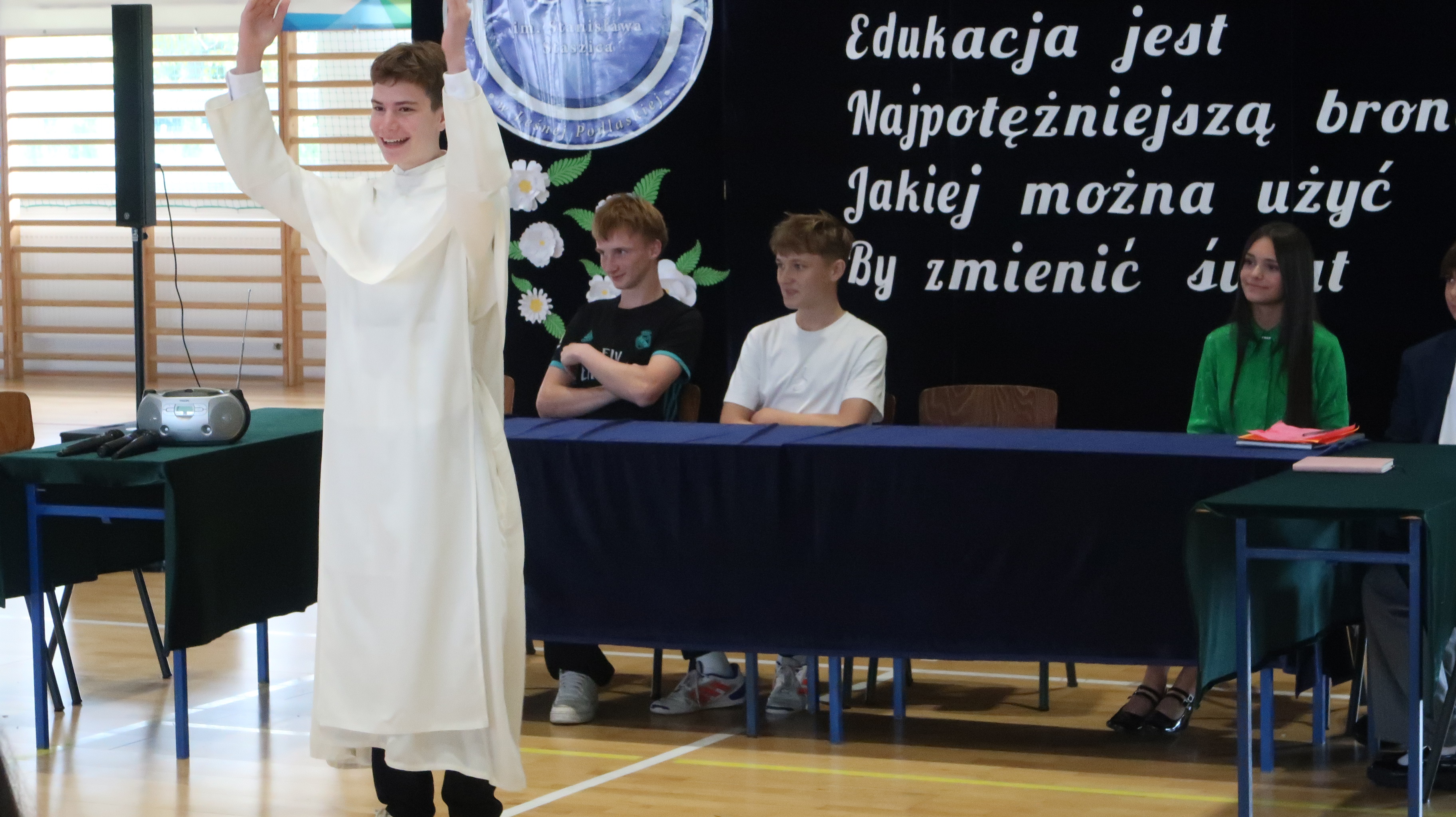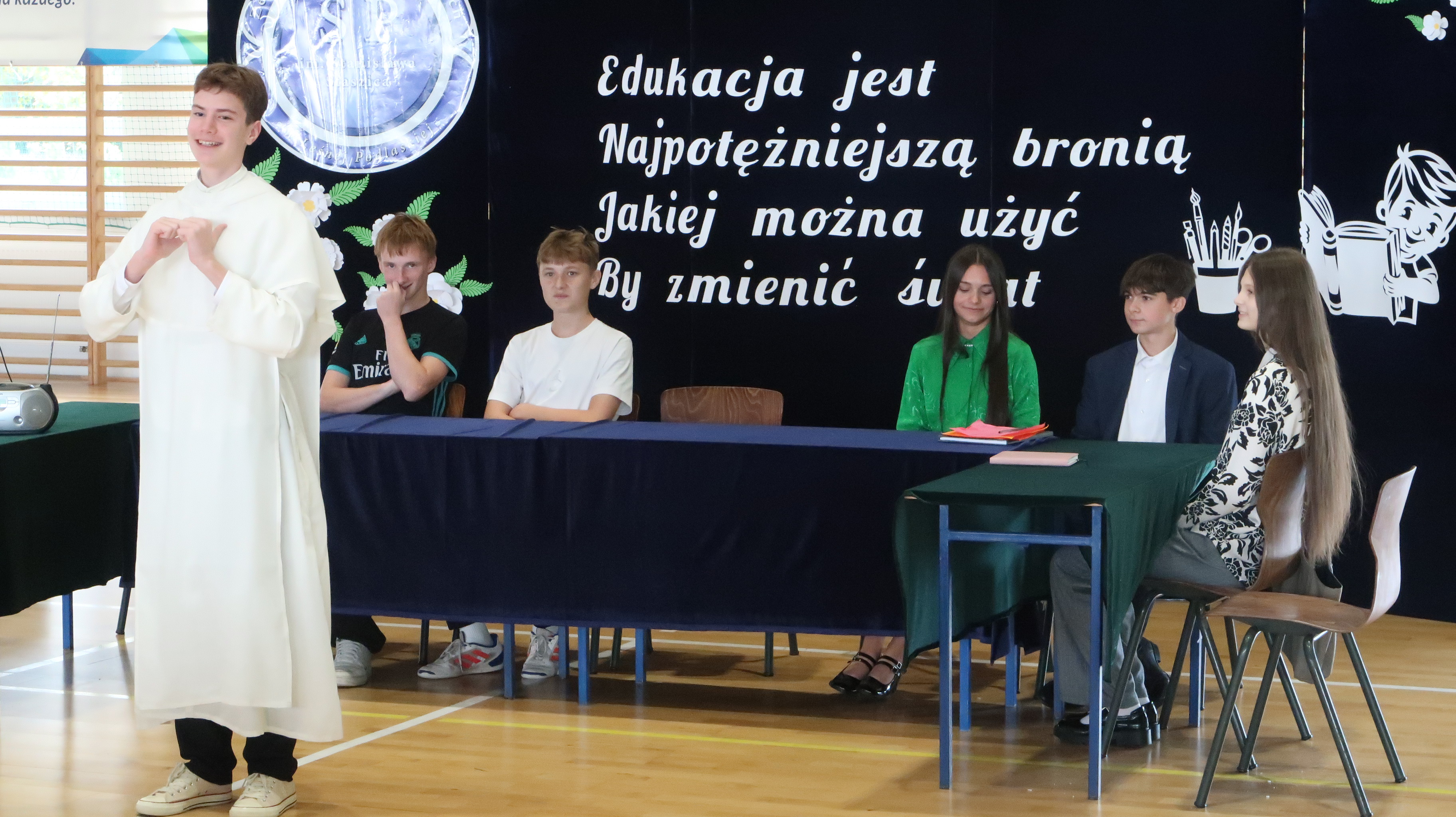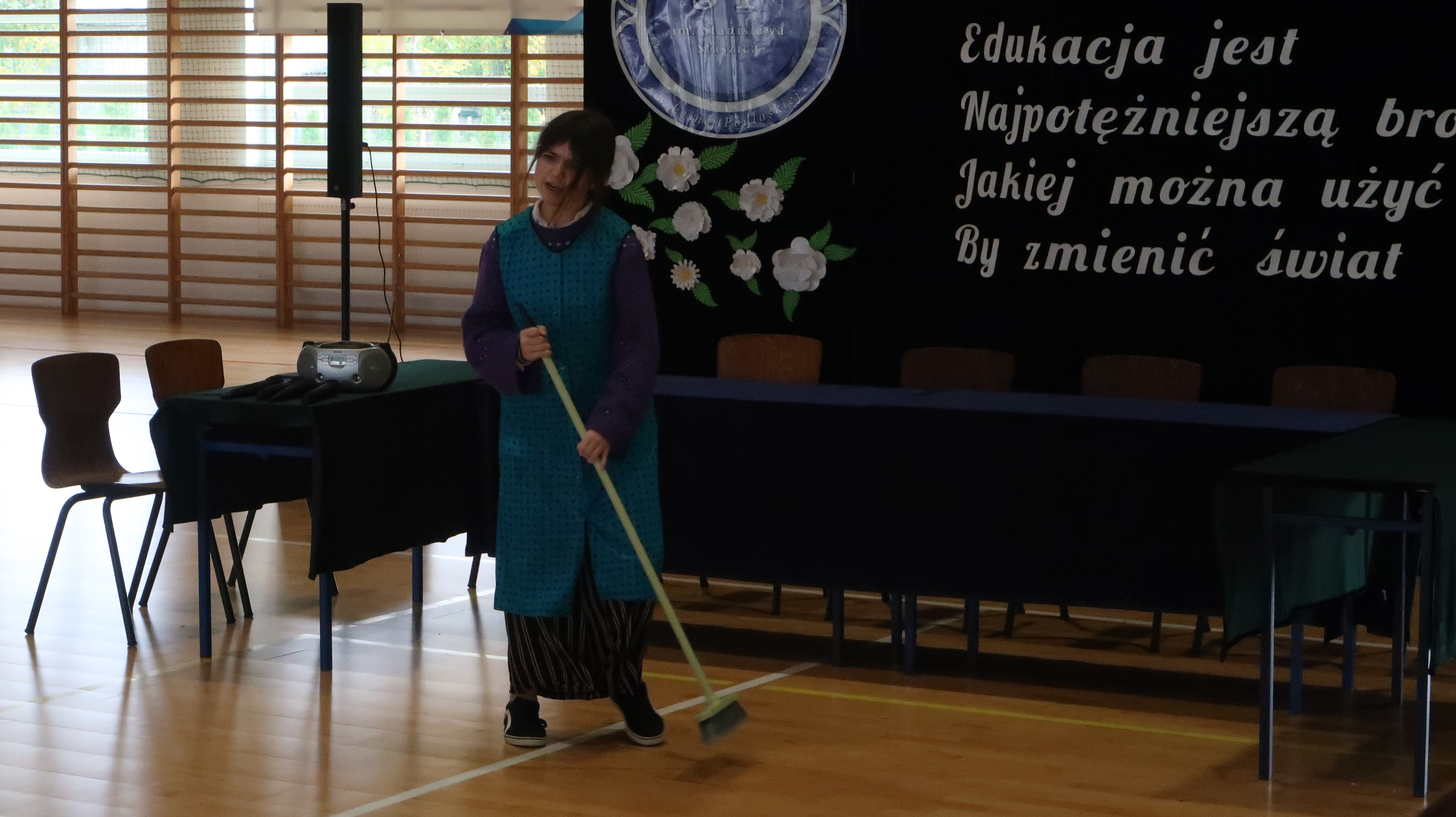 Warto w tym miejscu wspomnieć o obsadzie naszego szkolnego spektaklu. W rolach osób wprowadzających wystąpili: Julian Pieczykolan, Iga Struk, Kornelia Winogradow, Maja Michaluk, Jakub Położyński, Natalia Rogal, Marcin Adamowski, Szymon Szyc. W roli dyrektora – Piotr Horbowiec, wicedyrektora – Blanka Sekuła, nauczycieli: Julia Michaluk, Szymon Dacewicz, Julian Mikulski, Jakub Filipiuk, Kamila Chalimoniuk, w roli księdza – Gabriel Pieczykolan, pani pedagog – Zuzanna Jabłońska, natomiast w roli woźnej – Julia Jóźwiak.