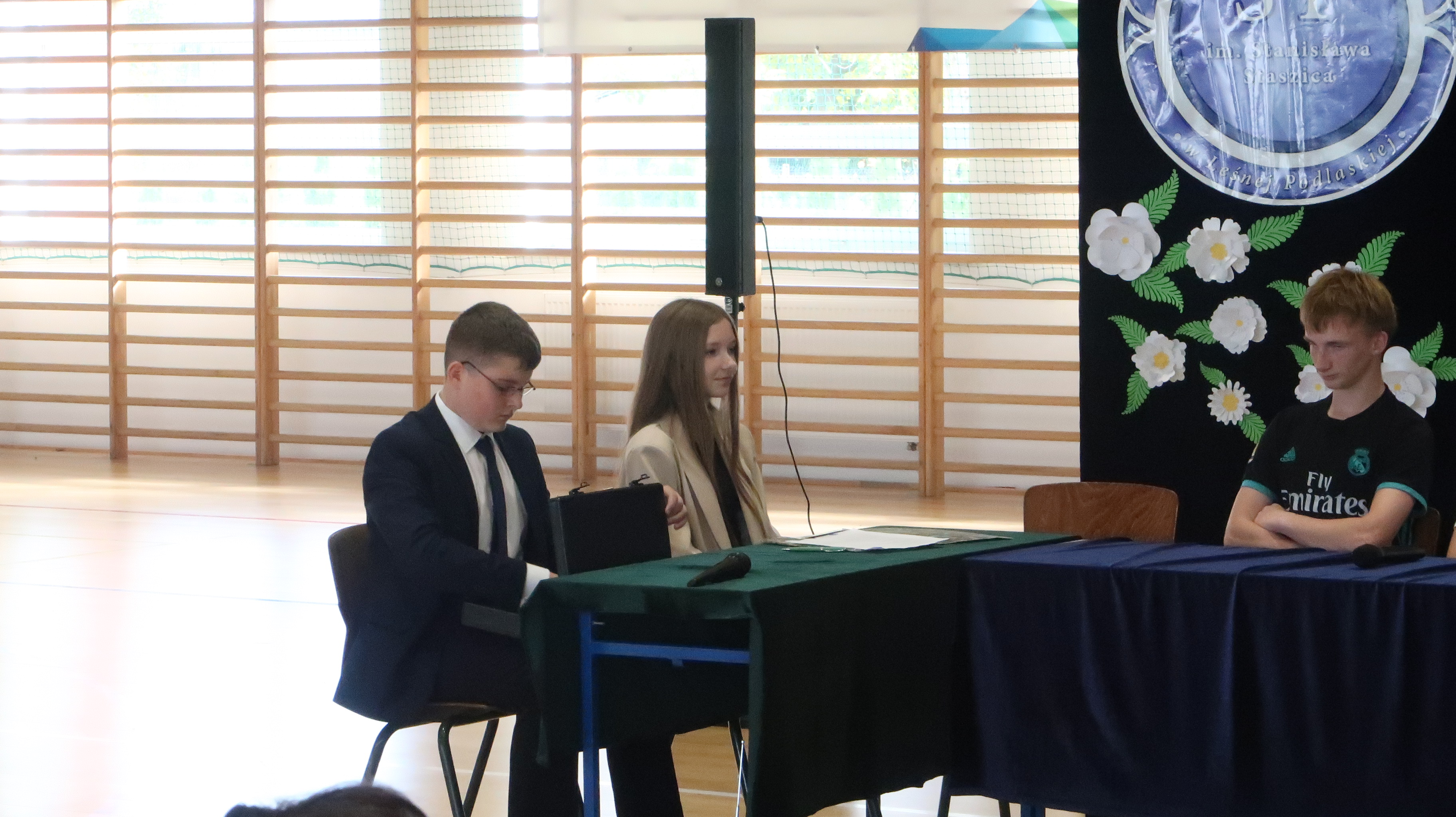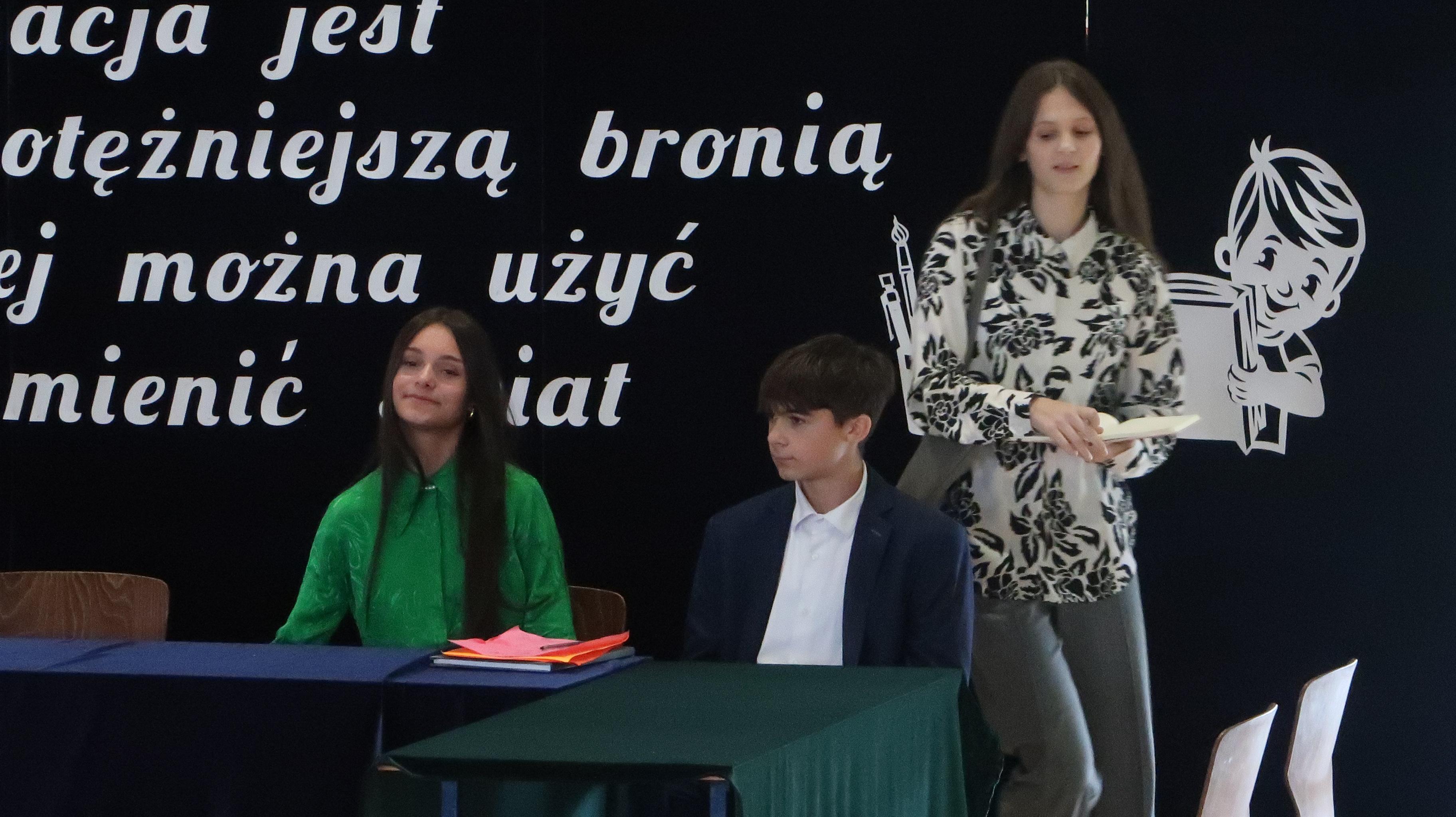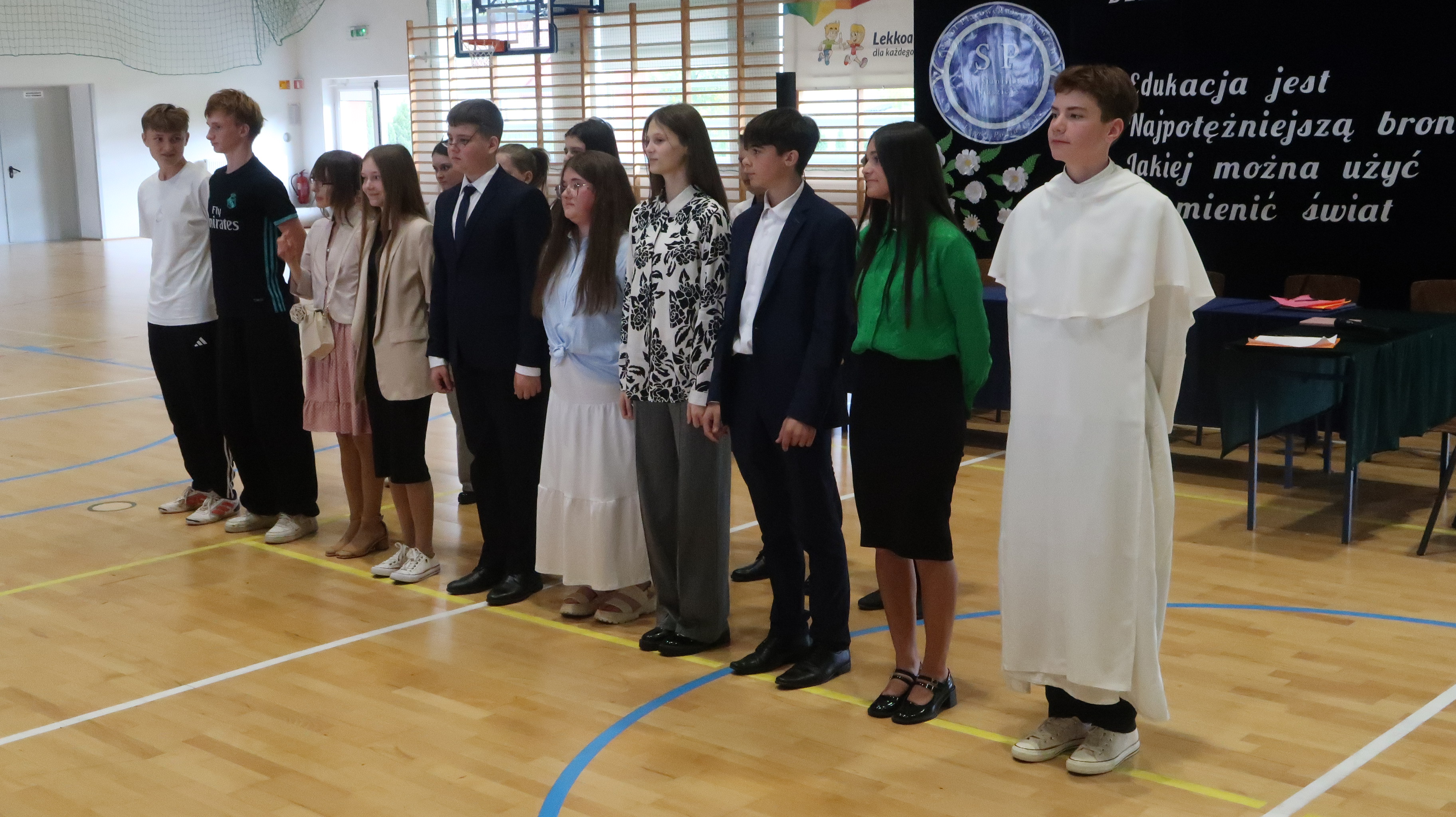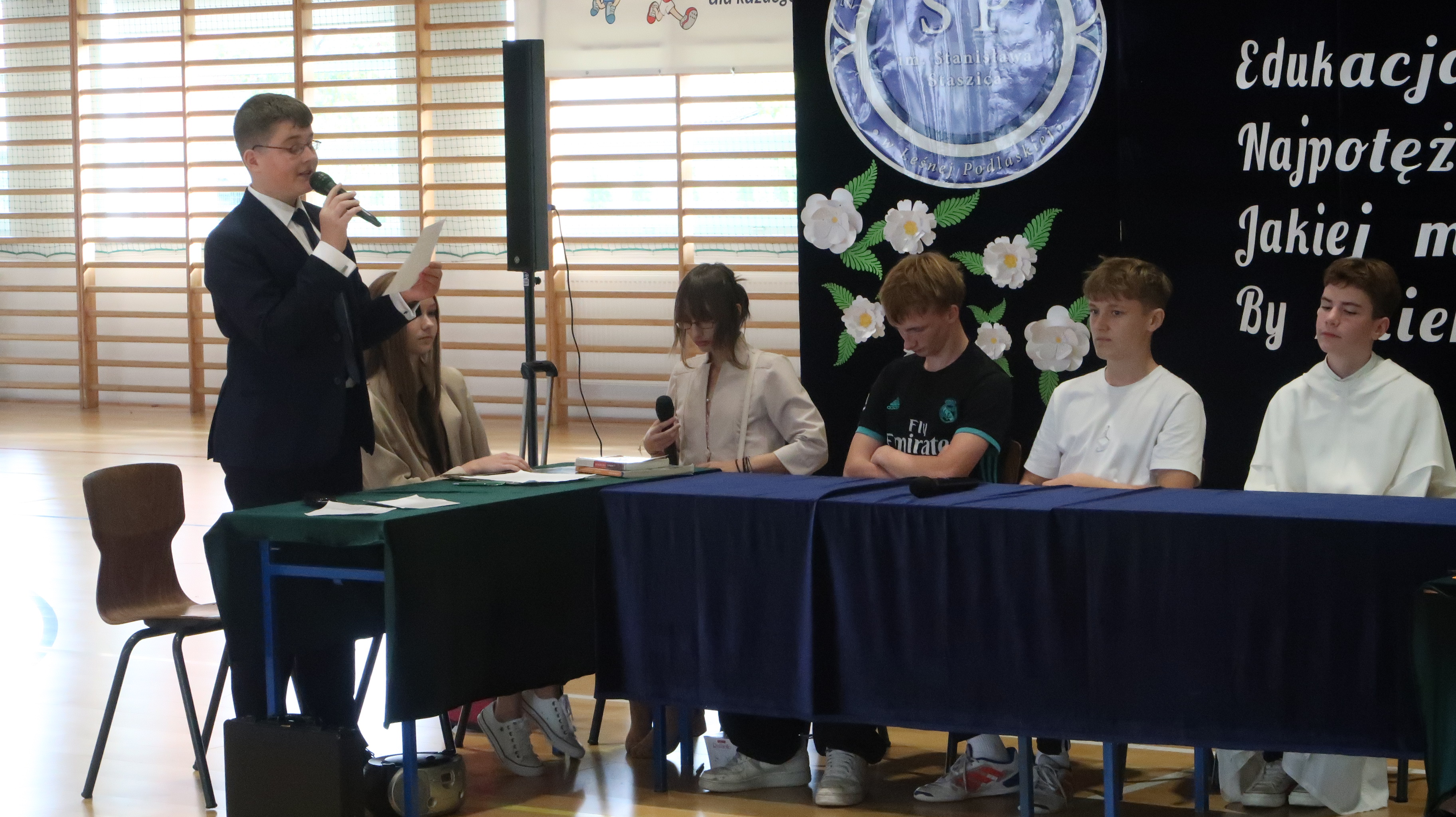 Warto w tym miejscu wspomnieć o obsadzie naszego szkolnego spektaklu. W rolach osób wprowadzających wystąpili: Julian Pieczykolan, Iga Struk, Kornelia Winogradow, Maja Michaluk, Jakub Położyński, Natalia Rogal, Marcin Adamowski, Szymon Szyc. W roli dyrektora – Piotr Horbowiec, wicedyrektora – Blanka Sekuła, nauczycieli: Julia Michaluk, Szymon Dacewicz, Julian Mikulski, Jakub Filipiuk, Kamila Chalimoniuk, w roli księdza – Gabriel Pieczykolan, pani pedagog – Zuzanna Jabłońska, natomiast w roli woźnej – Julia Jóźwiak.