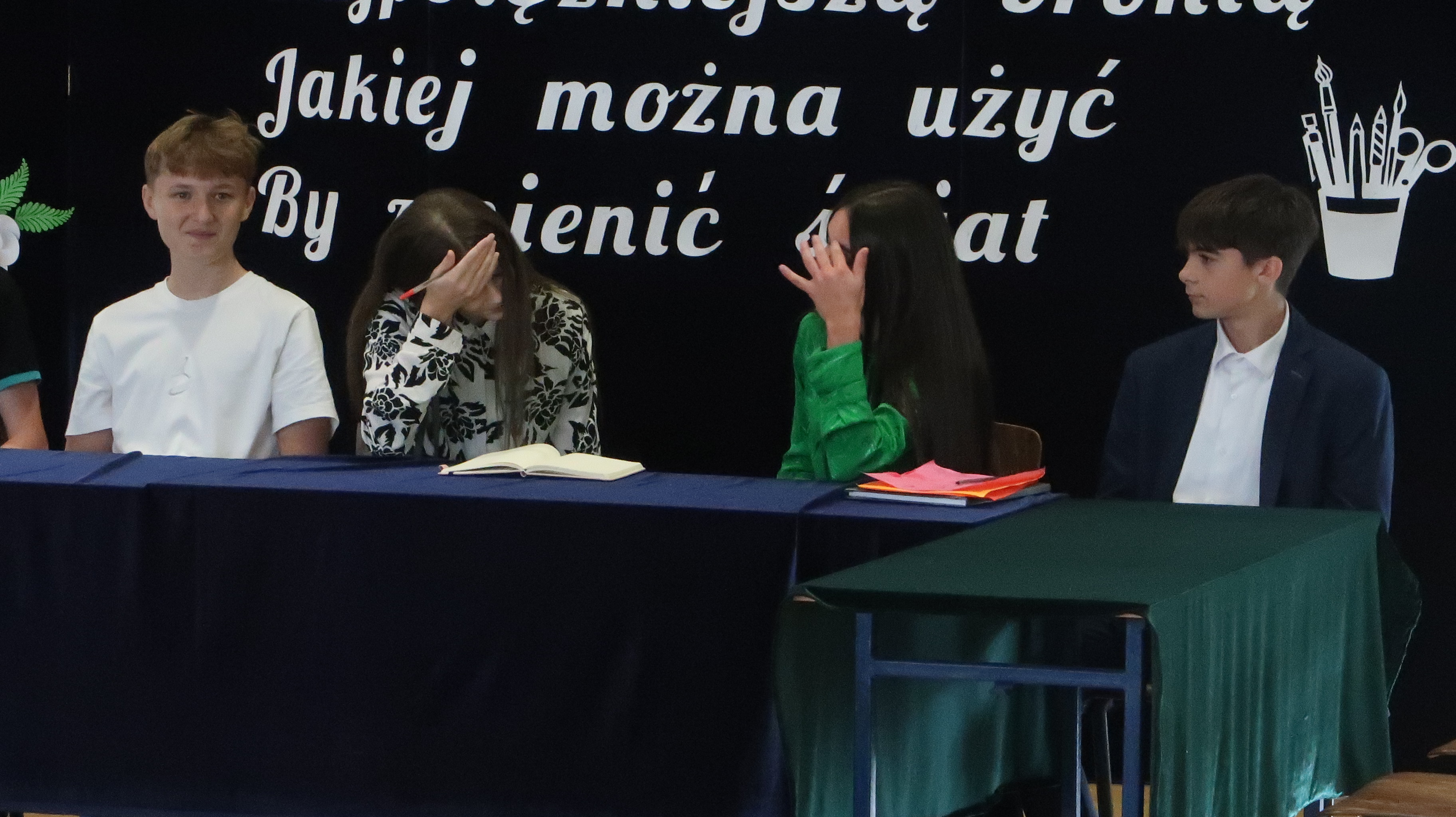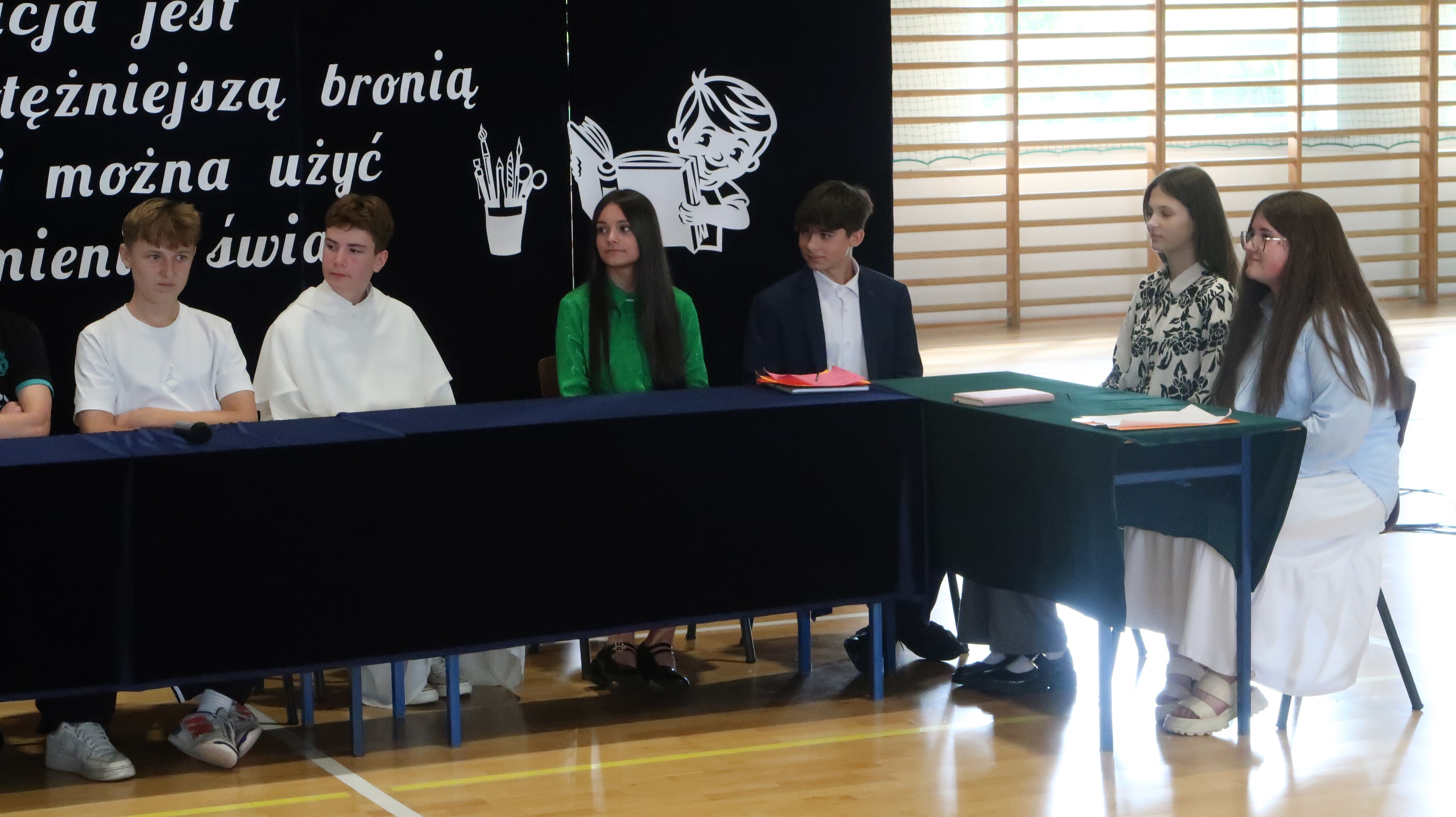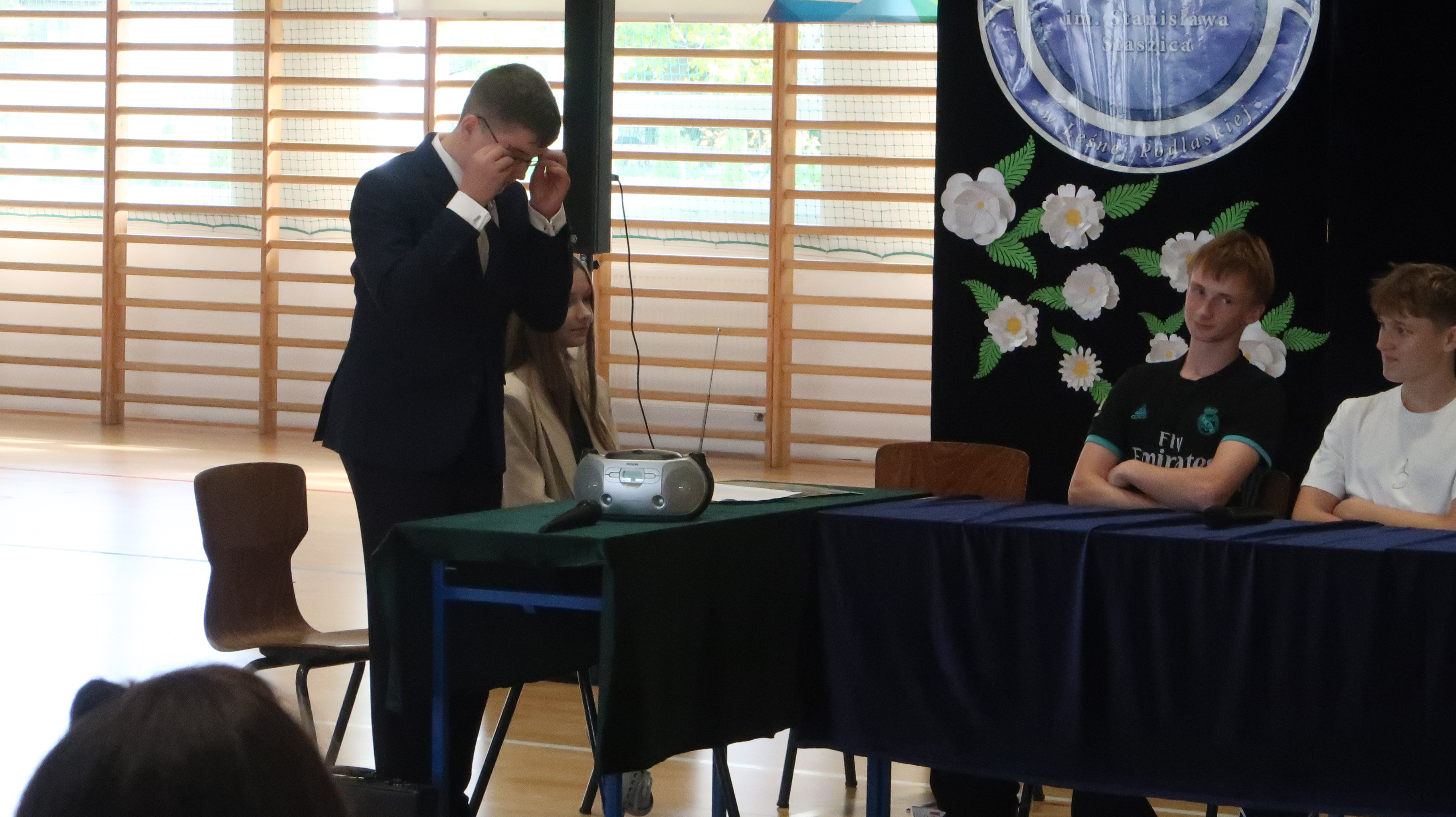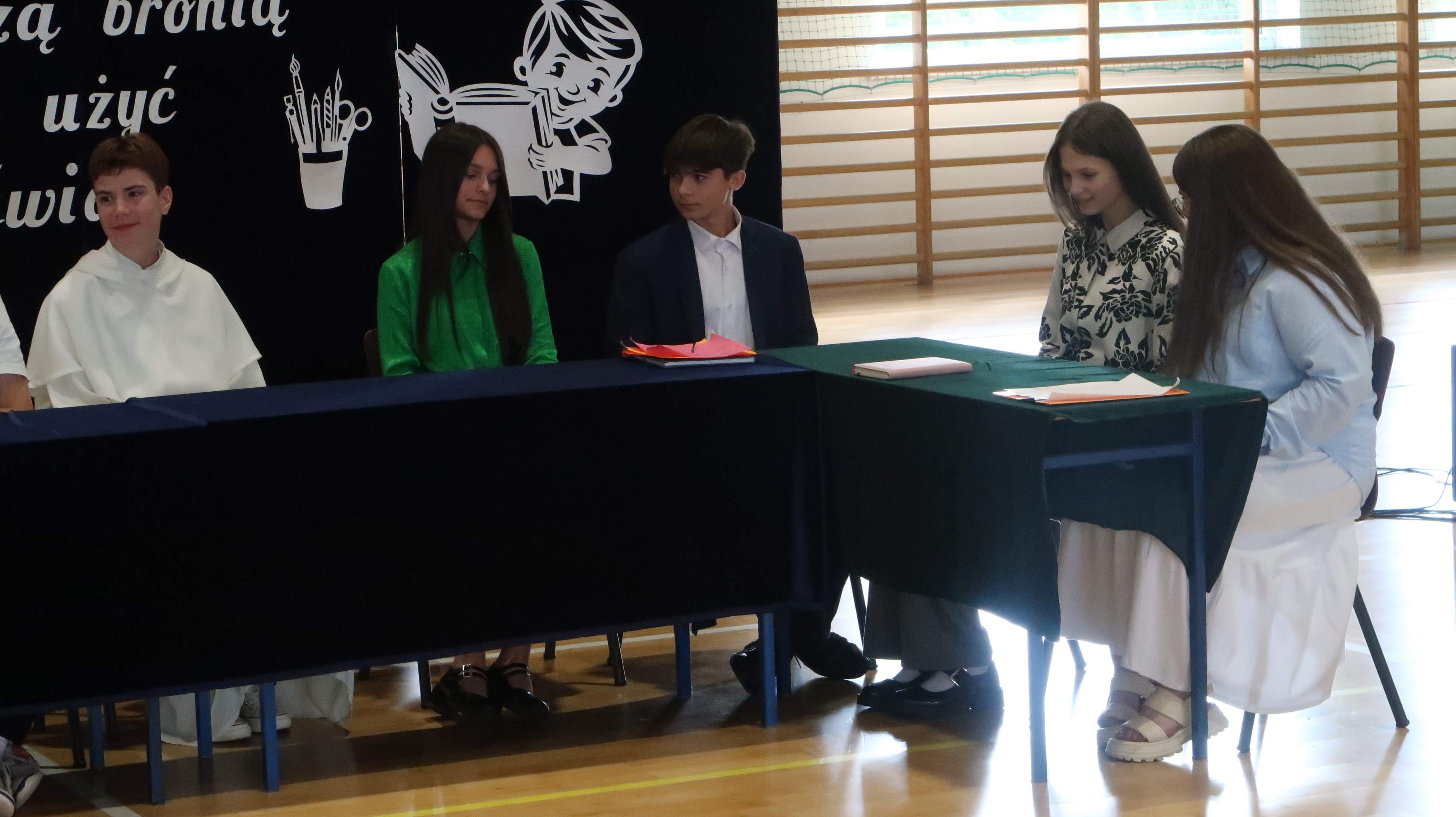 Warto w tym miejscu wspomnieć o obsadzie naszego szkolnego spektaklu. W rolach osób wprowadzających wystąpili: Julian Pieczykolan, Iga Struk, Kornelia Winogradow, Maja Michaluk, Jakub Położyński, Natalia Rogal, Marcin Adamowski, Szymon Szyc. W roli dyrektora – Piotr Horbowiec, wicedyrektora – Blanka Sekuła, nauczycieli: Julia Michaluk, Szymon Dacewicz, Julian Mikulski, Jakub Filipiuk, Kamila Chalimoniuk, w roli księdza – Gabriel Pieczykolan, pani pedagog – Zuzanna Jabłońska, natomiast w roli woźnej – Julia Jóźwiak.