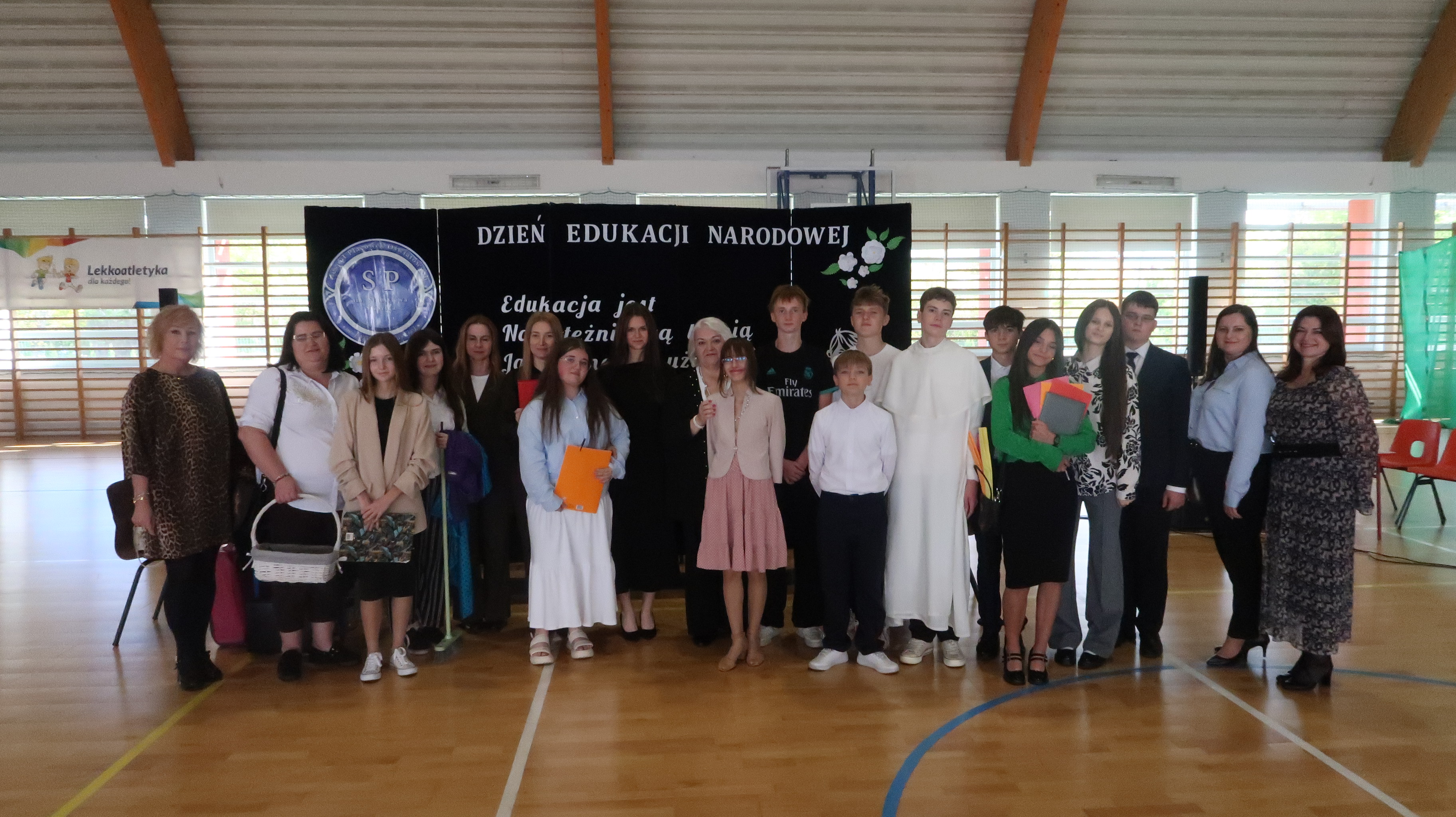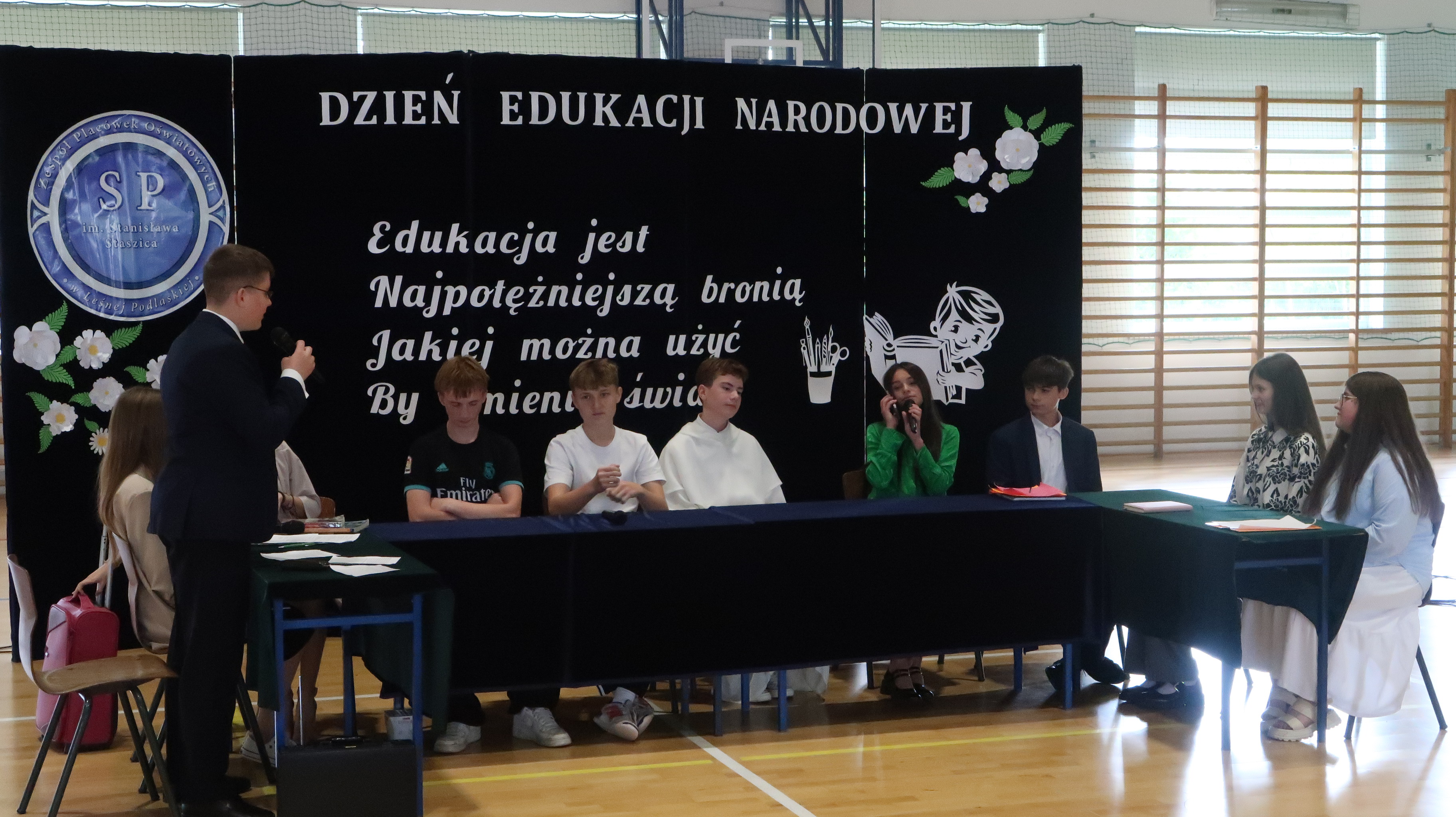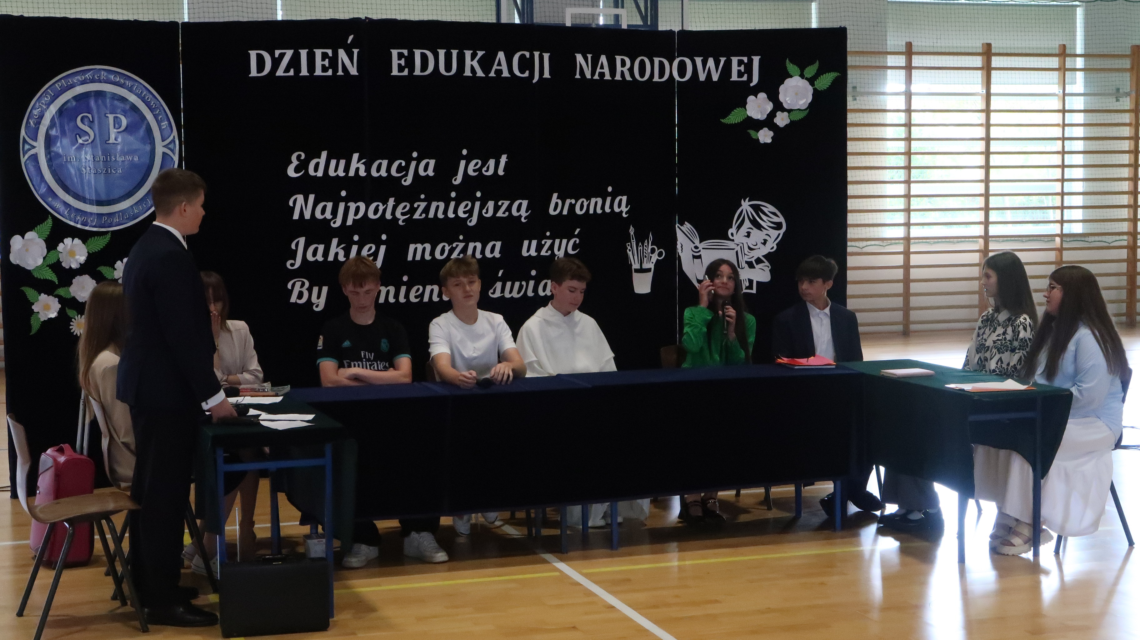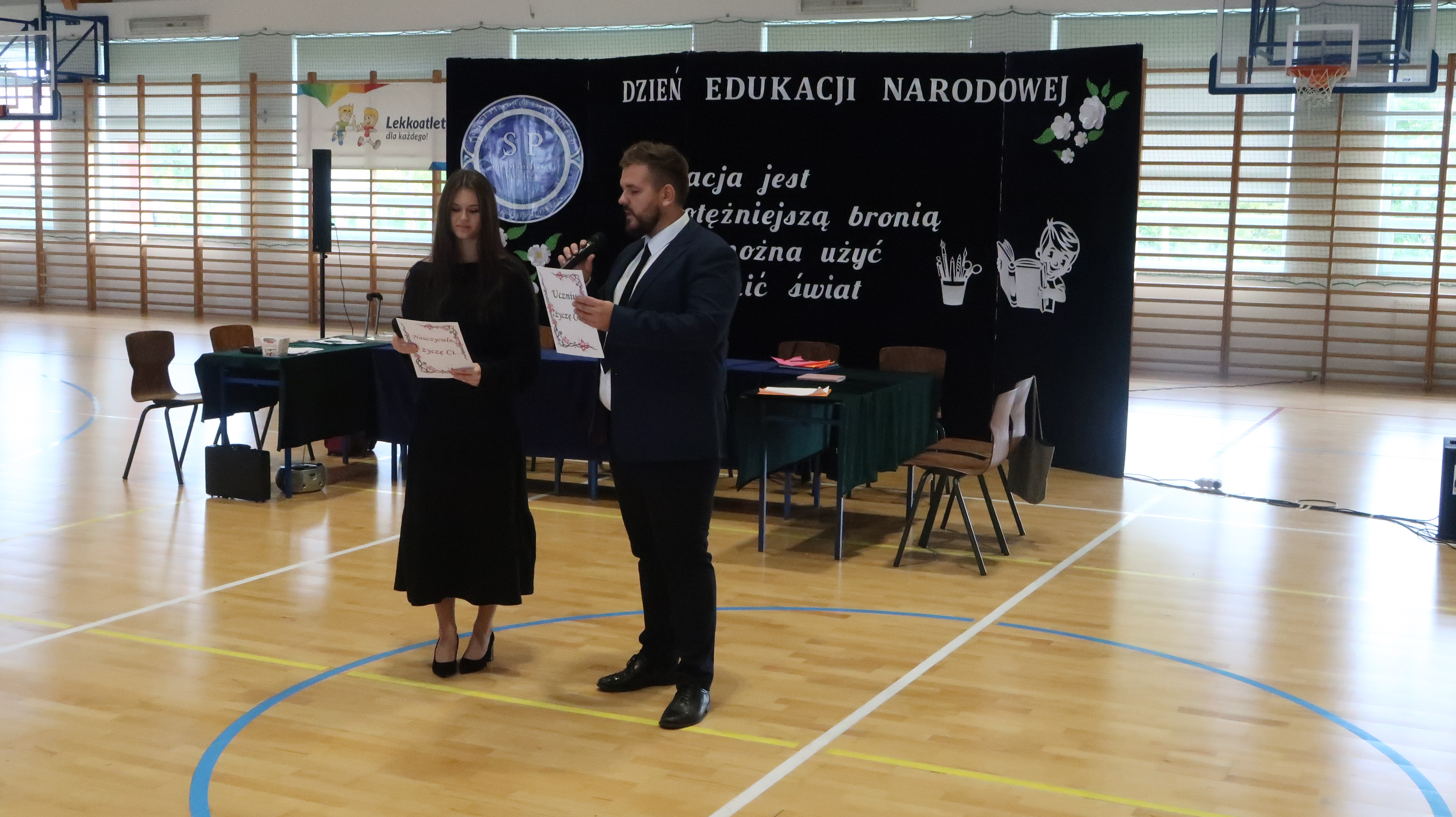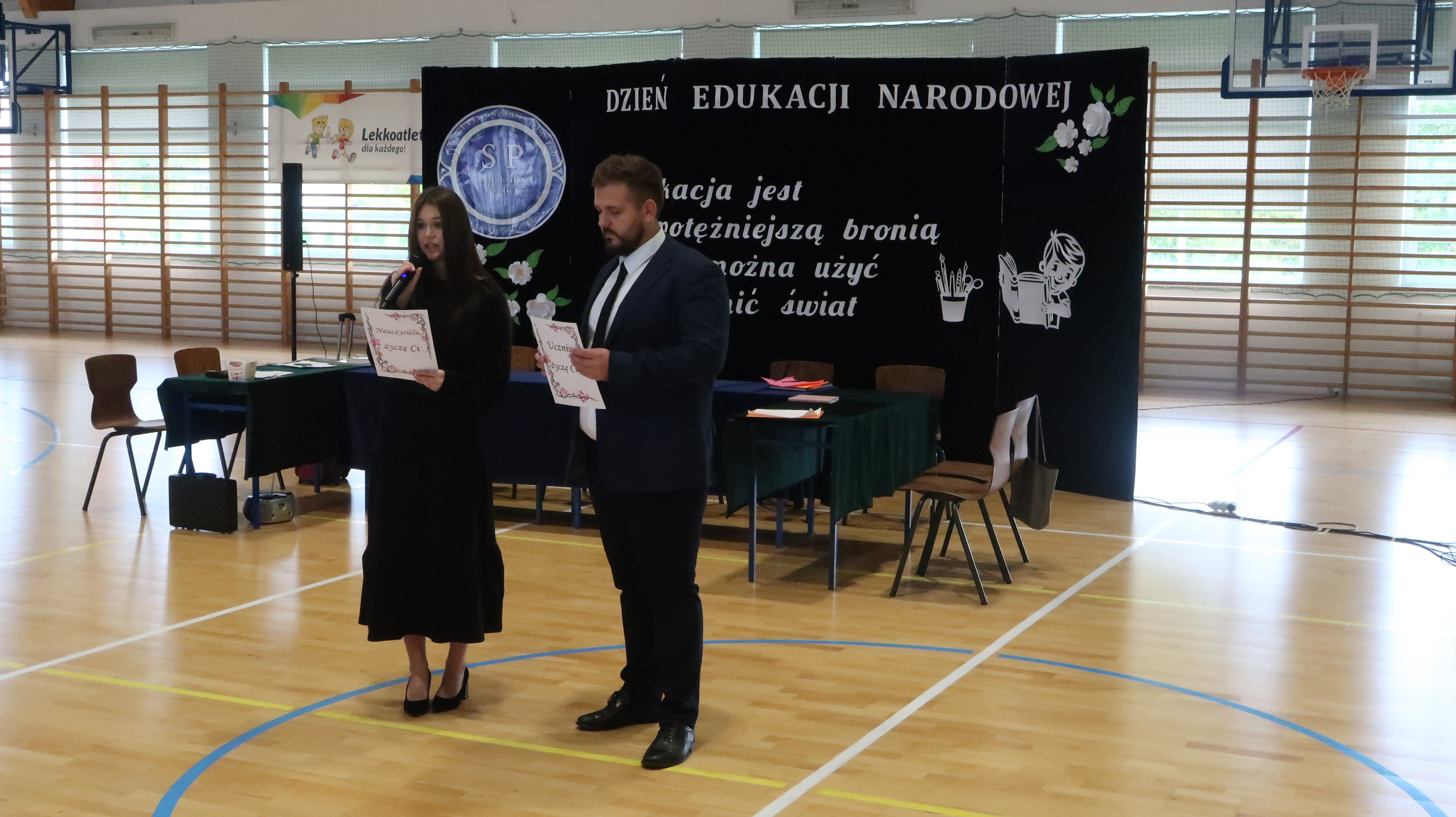 W poniedziałek, 13 października, świętowaliśmy Dzień Edukacji Narodowej. W naszej szkolnej uroczystości uczestniczyli p. Anna Bąkowska – sekretarz Gminy Leśna Podlaska, p. Bożena Abramowicz – kierownik Gminnej Biblioteki Publicznej w Leśnej Podlaskiej, p. Agata Dunajko – przewodnicząca Rady Rodziców Szkoły Podstawowej w Leśnej Podlaskiej, p. Barbara Horbowiec – zastępca przewodniczącej Rady Rodziców, dyrekcja, nauczyciele, uczniowie, pracownicy szkoły oraz rodzice.