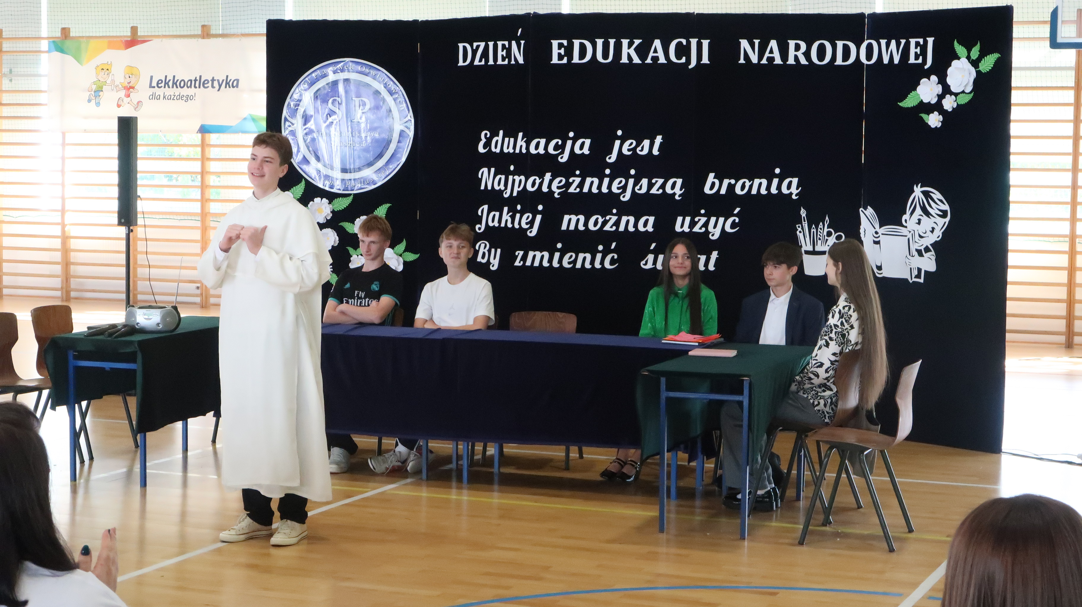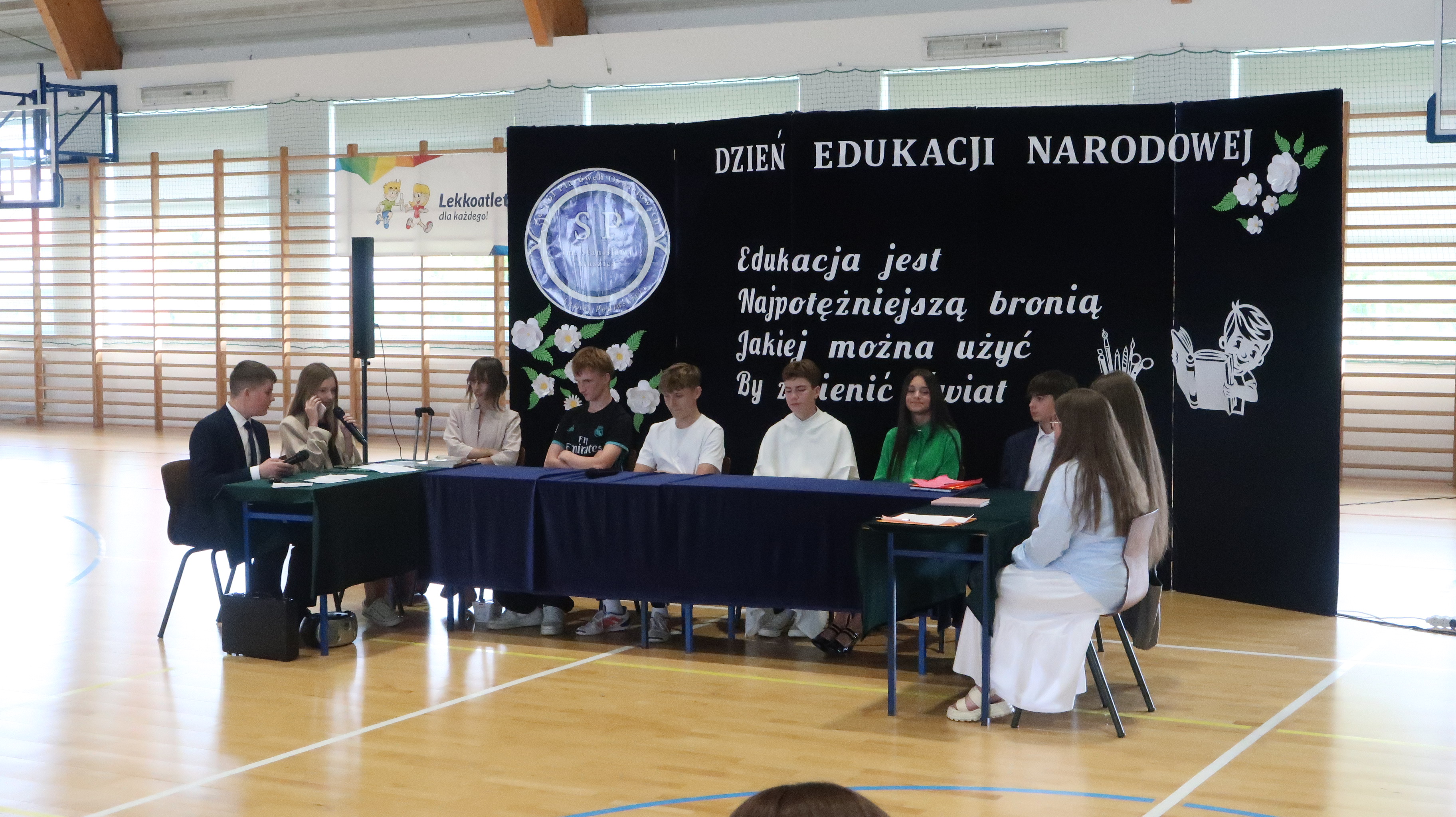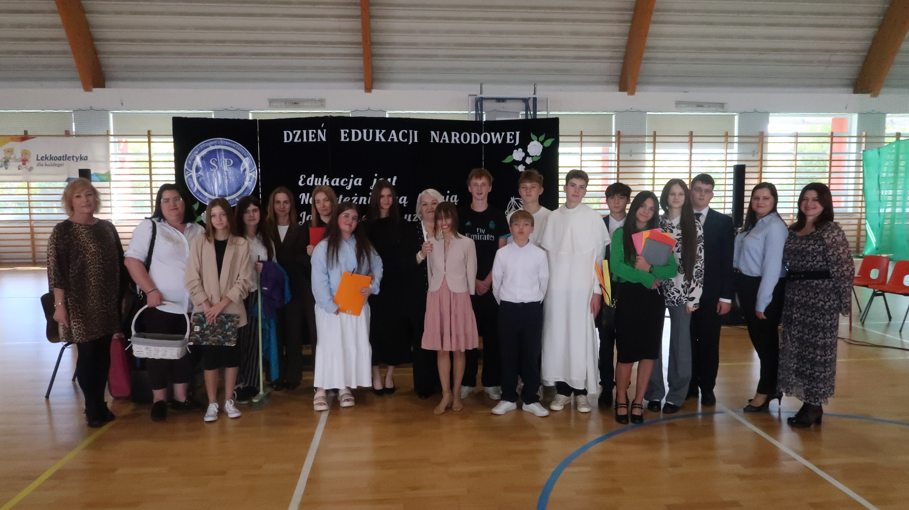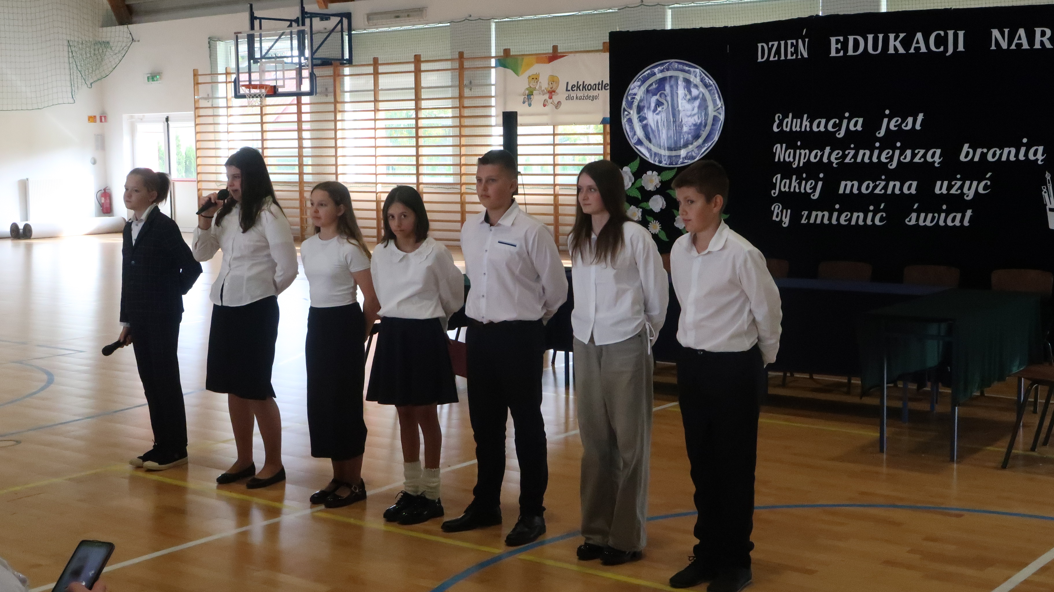 W poniedziałek, 13 października, świętowaliśmy Dzień Edukacji Narodowej. W naszej szkolnej uroczystości uczestniczyli p. Anna Bąkowska – sekretarz Gminy Leśna Podlaska, p. Bożena Abramowicz – kierownik Gminnej Biblioteki Publicznej w Leśnej Podlaskiej, p. Agata Dunajko – przewodnicząca Rady Rodziców Szkoły Podstawowej w Leśnej Podlaskiej, p. Barbara Horbowiec – zastępca przewodniczącej Rady Rodziców, dyrekcja, nauczyciele, uczniowie, pracownicy szkoły oraz rodzice.