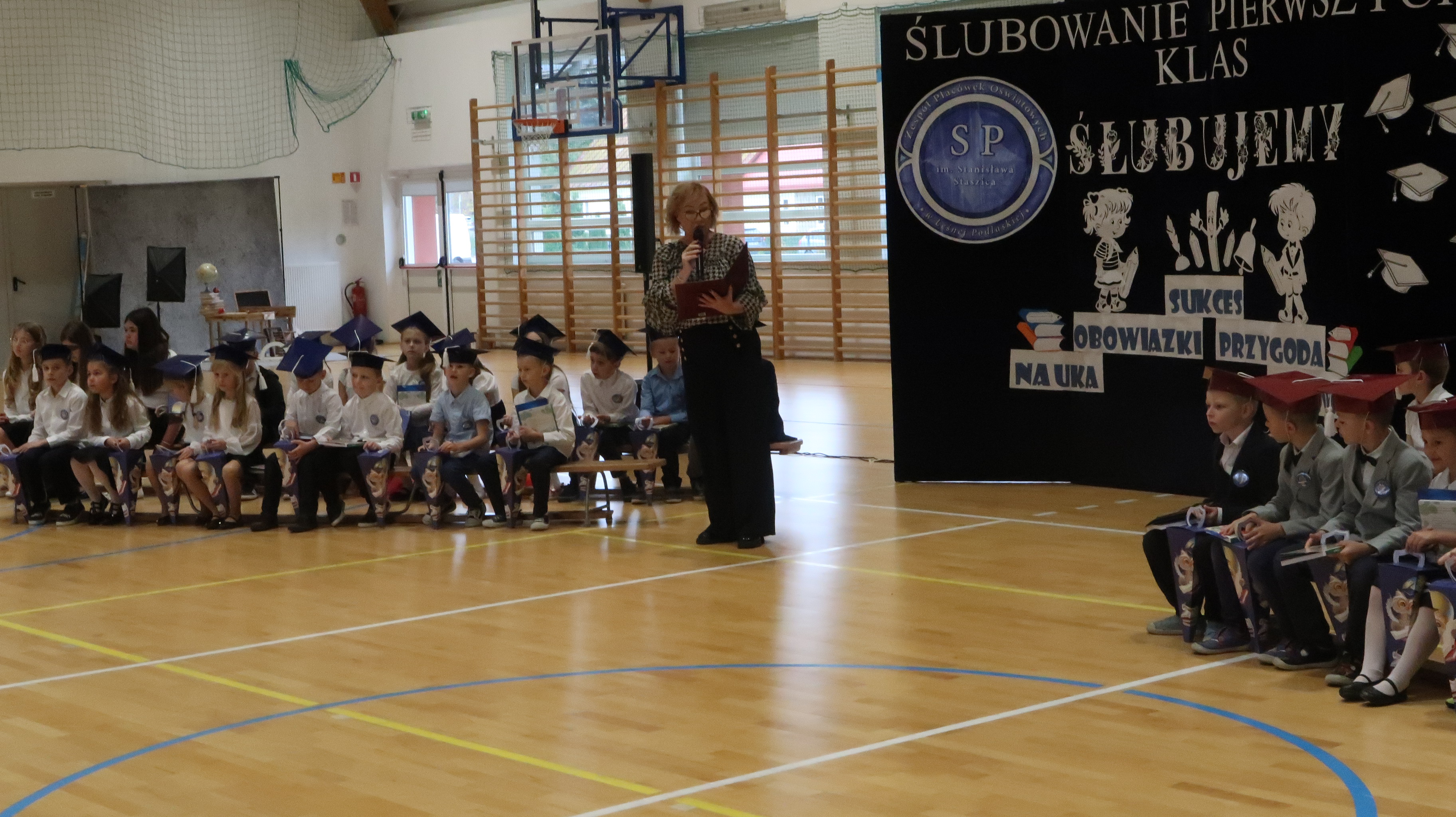 W niezwykle podniosłej atmosferze, przed pocztem sztandarowym pierwszoklasiści ślubowali być dobrymi uczniami i Polakami, swym zachowaniem i nauką sprawiać radość rodzicom i nauczycielom. Po złożeniu ślubowania pani dyrektor Małgorzata Adach wspólnie z Wójtem Gminy Leśna Podlaska panem Pawłem Kazimierskim dokonali symbolicznego pasowania na ucznia.