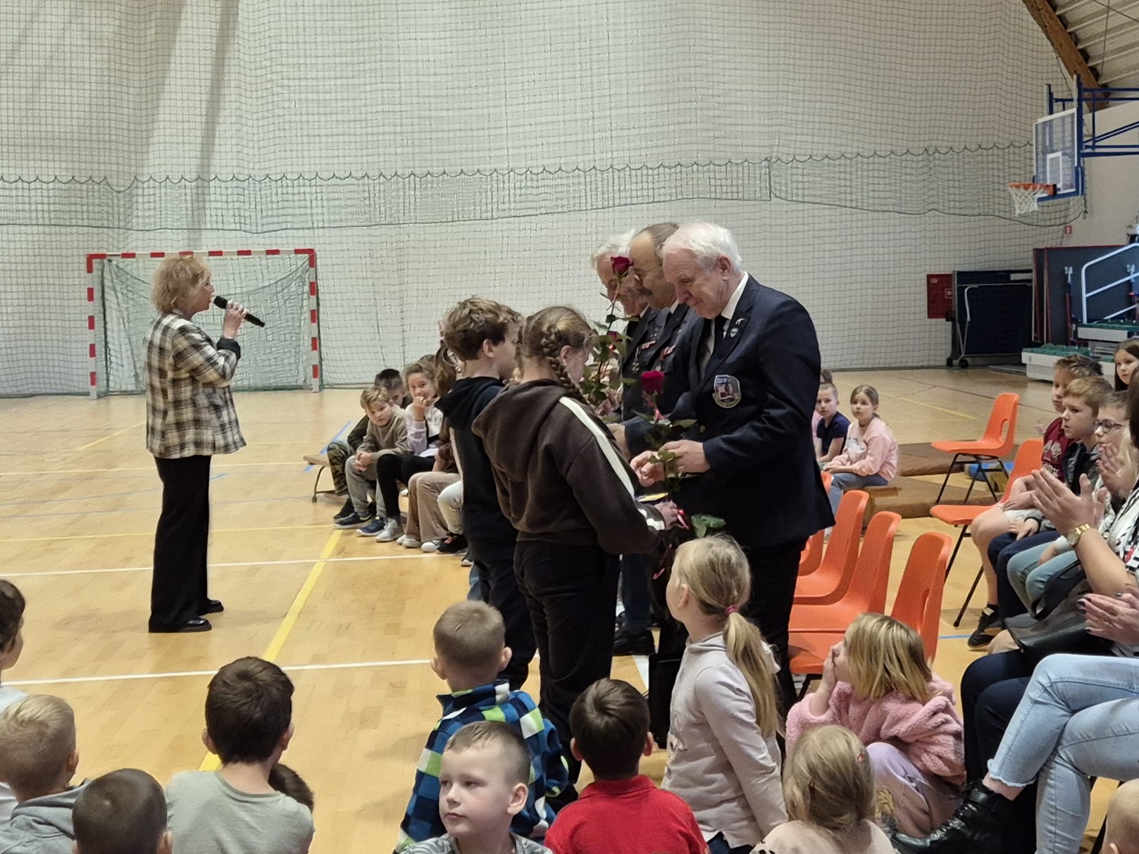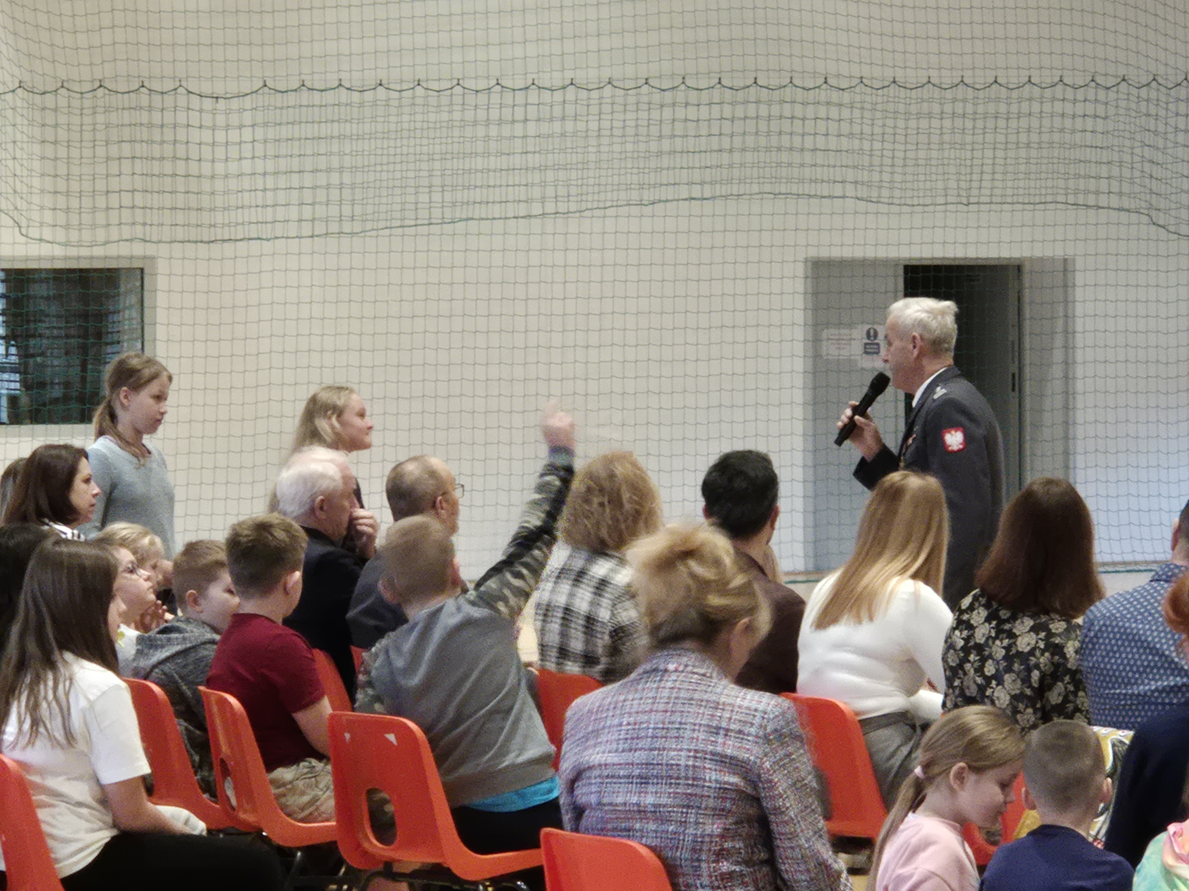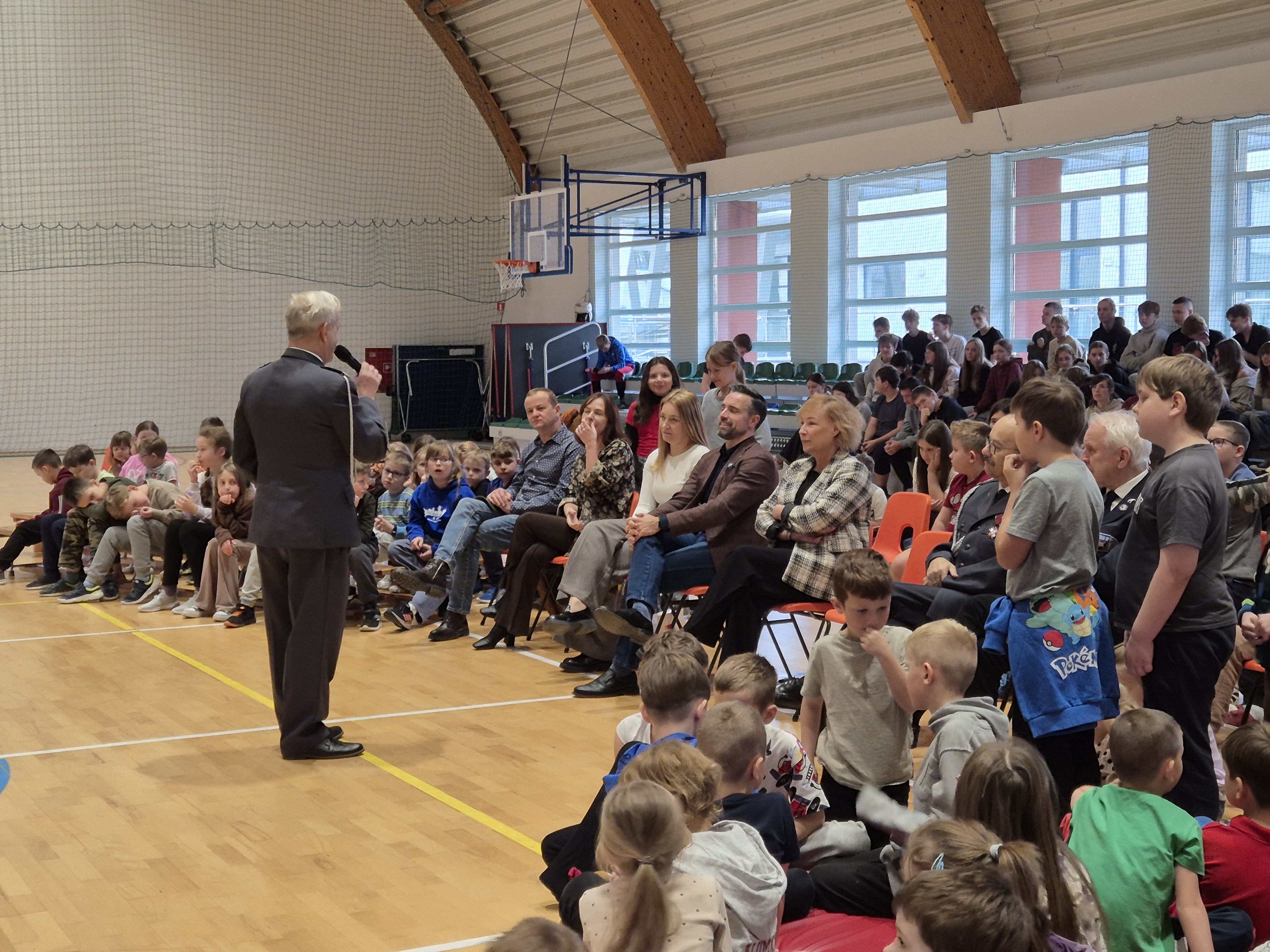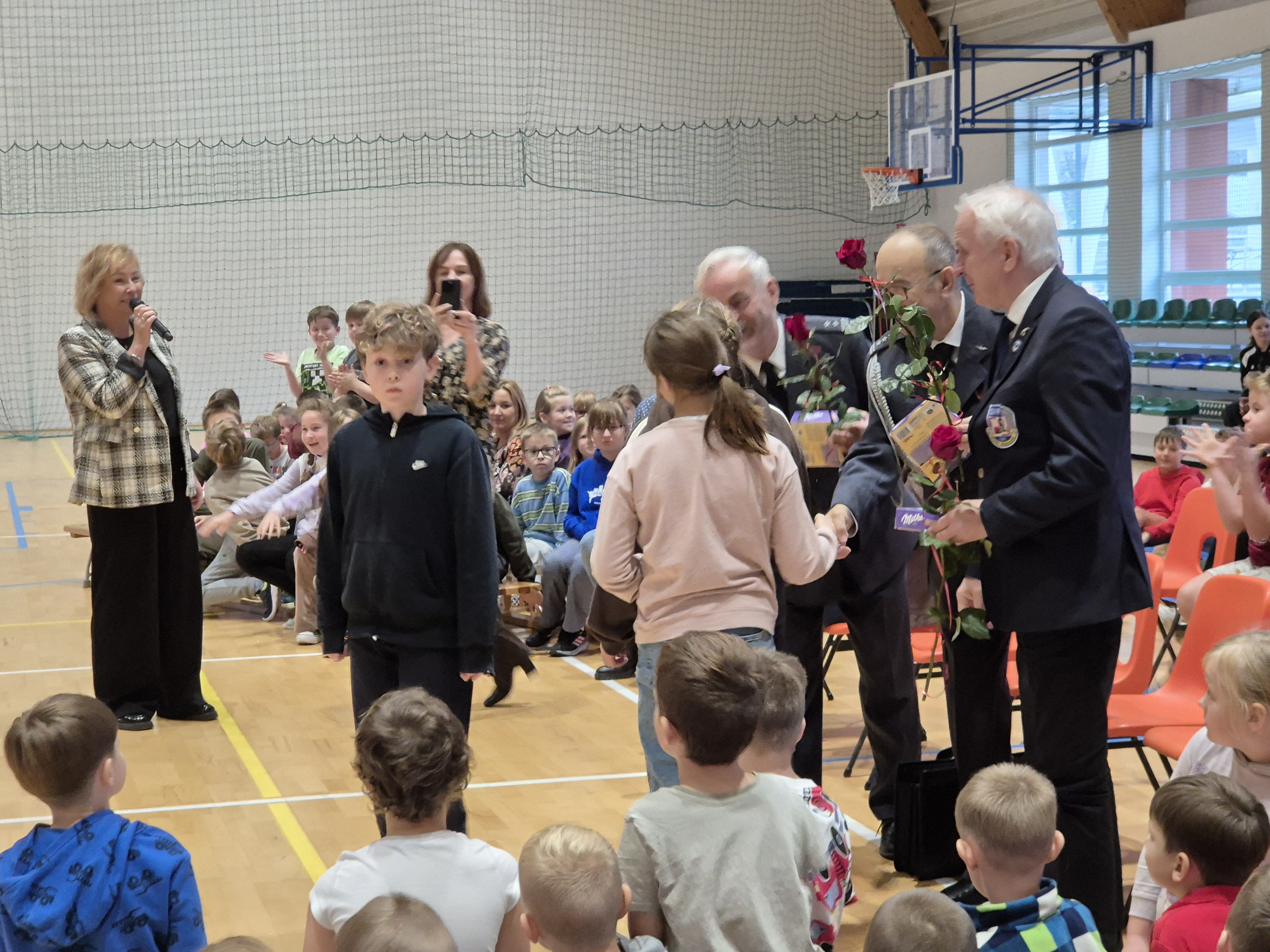 Panowie piloci przybyli do nas w stroju galowym pilota Sił Powietrznych to stalowy (steel grey) mundur wykonany z wełny, noszony z białą koszulą, czarnym krawatem i czapką garnizonową. Jeden z panów wystąpił w garniturze stowarzyszenia skupiającego lotników przebywających już na emeryturze. Piloci opowiadali naszym uczniom o swojej ścieżce kariery w zawodzie, o swoich przygodach związanych z lataniem samolotami. Bardzo ciekawą częścią spotkania była możliwość zadawania pytań, na które bardzo szczegółowo i wyczerpująco panowie udzielali odpowiedzi.