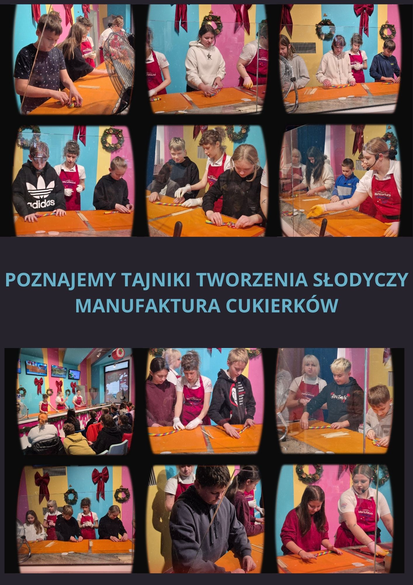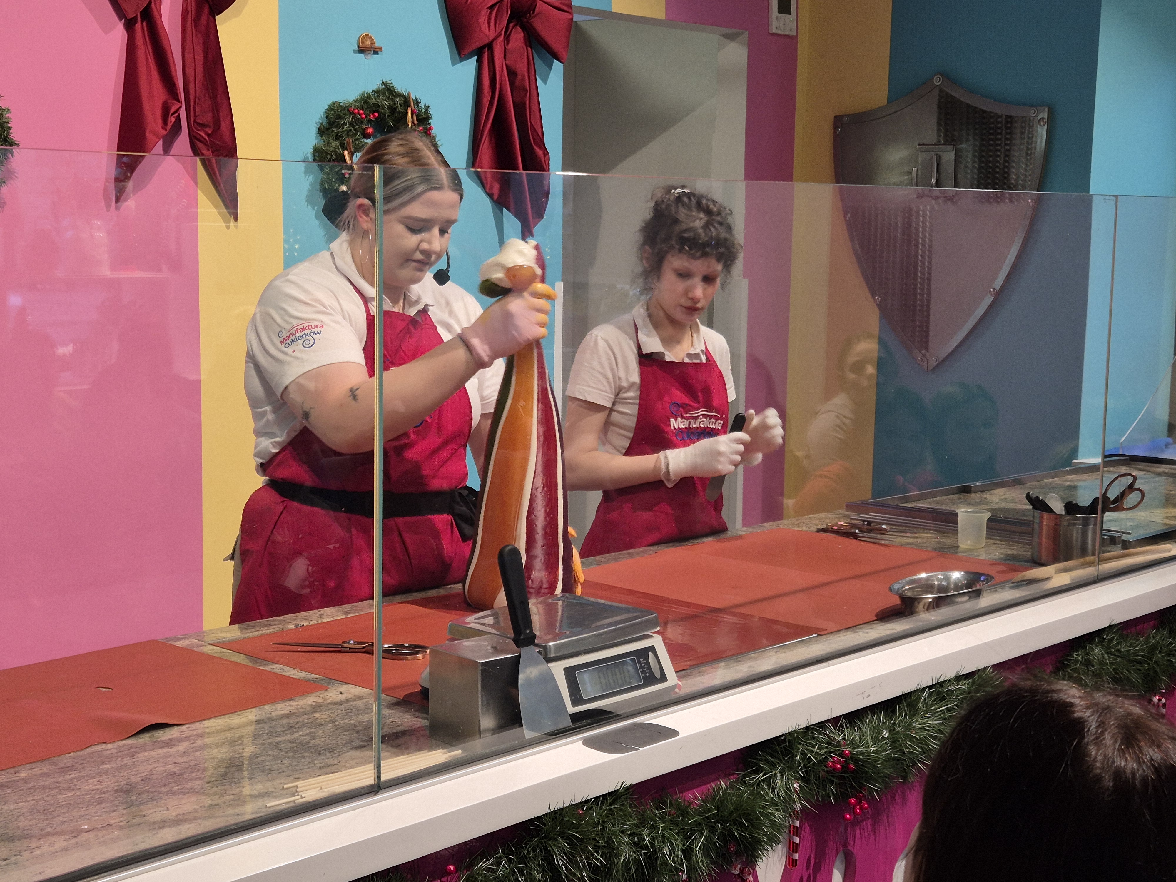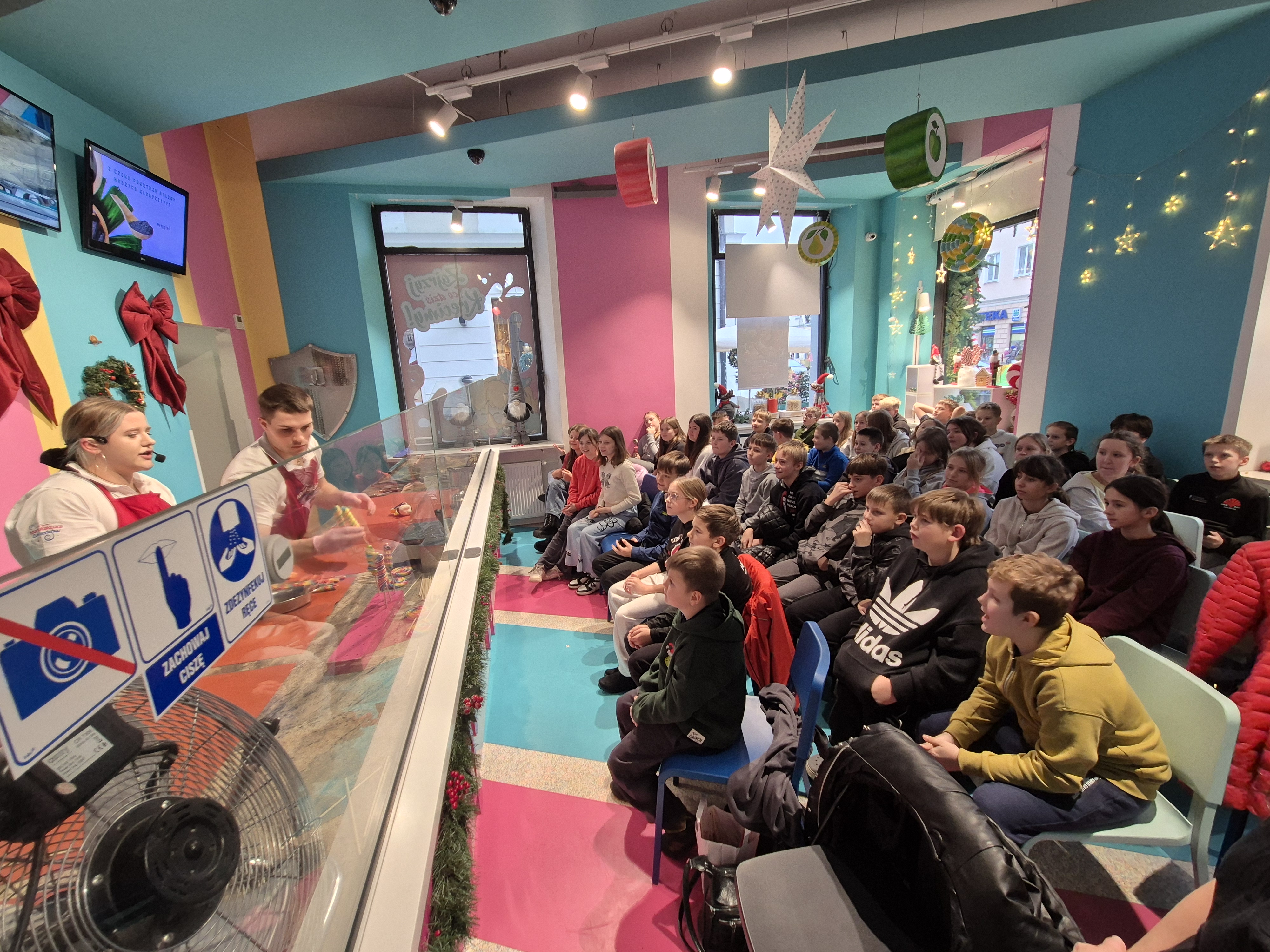 Kolejnym etapem wycieczki były warsztaty w manufakturze cukierków. Podczas zajęć uczniowie obserwowali proces powstawania słodyczy – od rozgrzewania masy cukrowej, przez barwienie i formowanie, aż do tworzenia gotowych cukierków o fantazyjnych kształtach. Każdy uczestnik mógł także spróbować swoich sił w samodzielnym skręcaniu kolorowych lizaków w kształcie choinki, co dostarczyło wielu uśmiechów i radości.