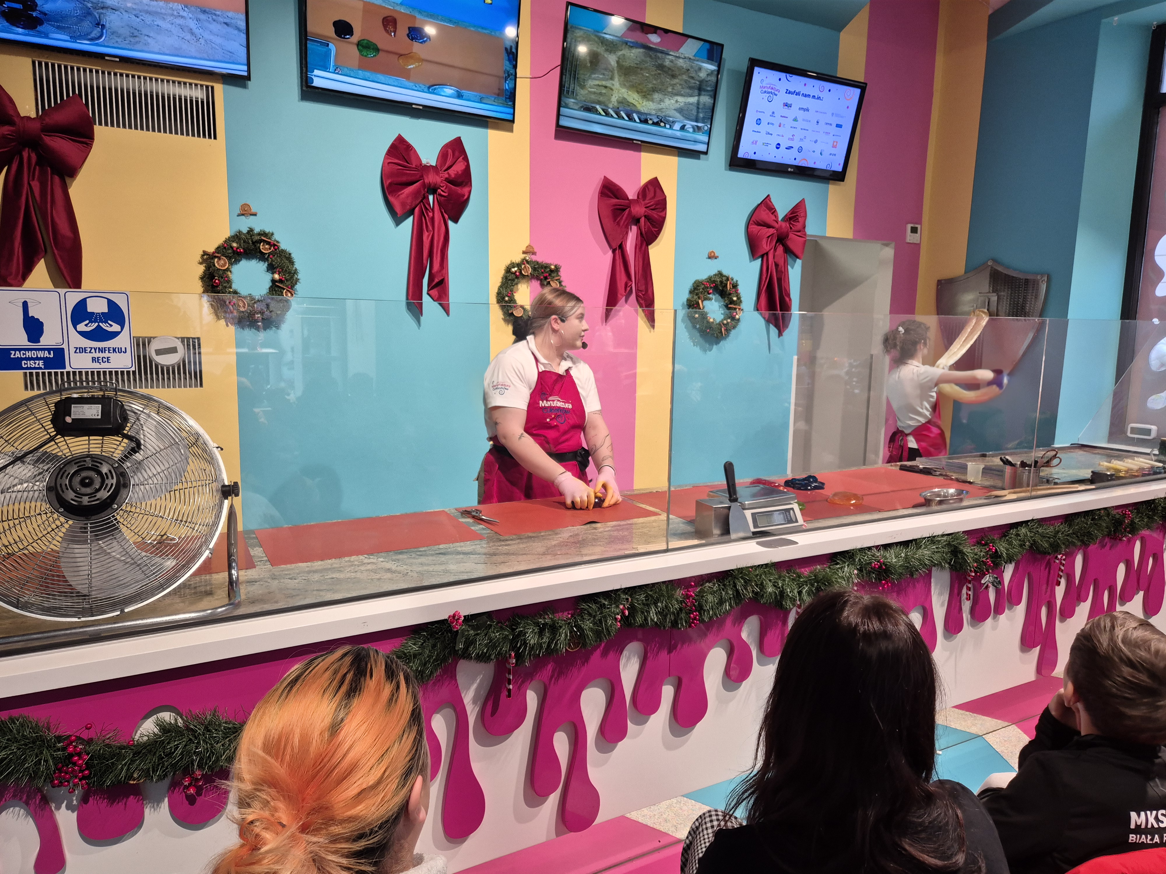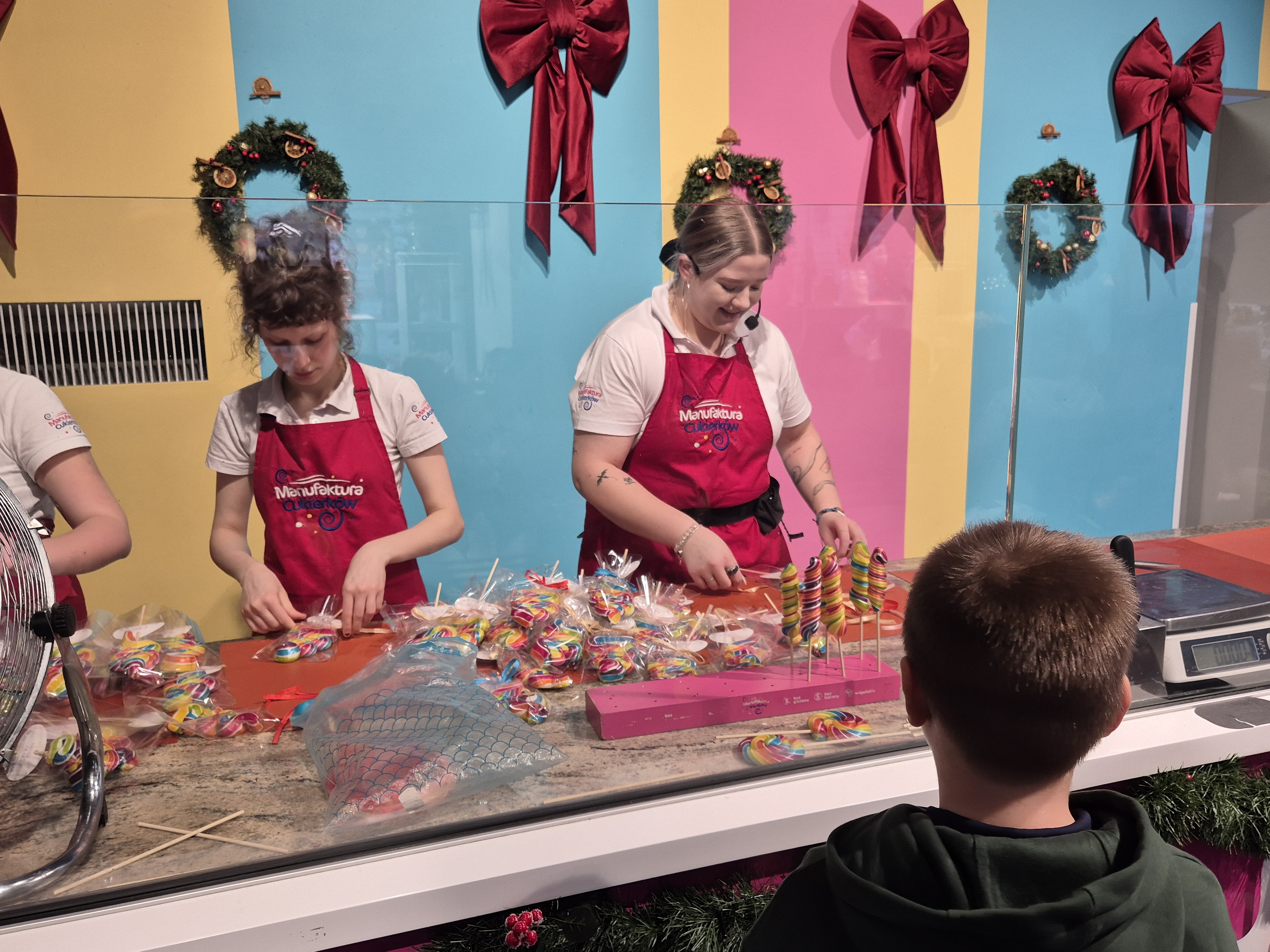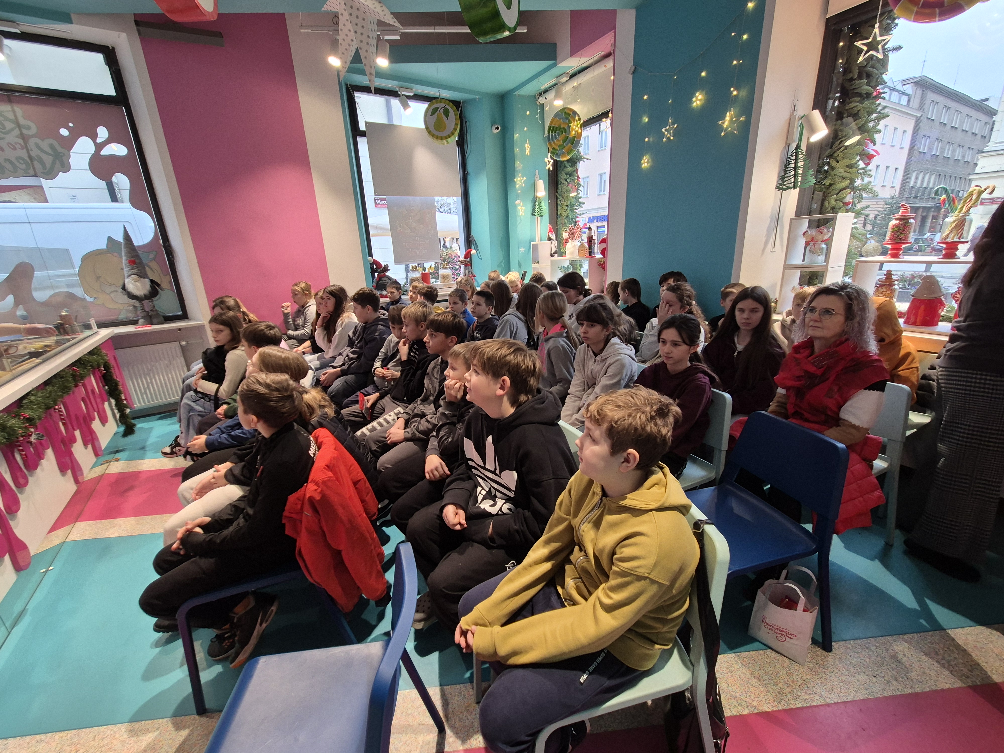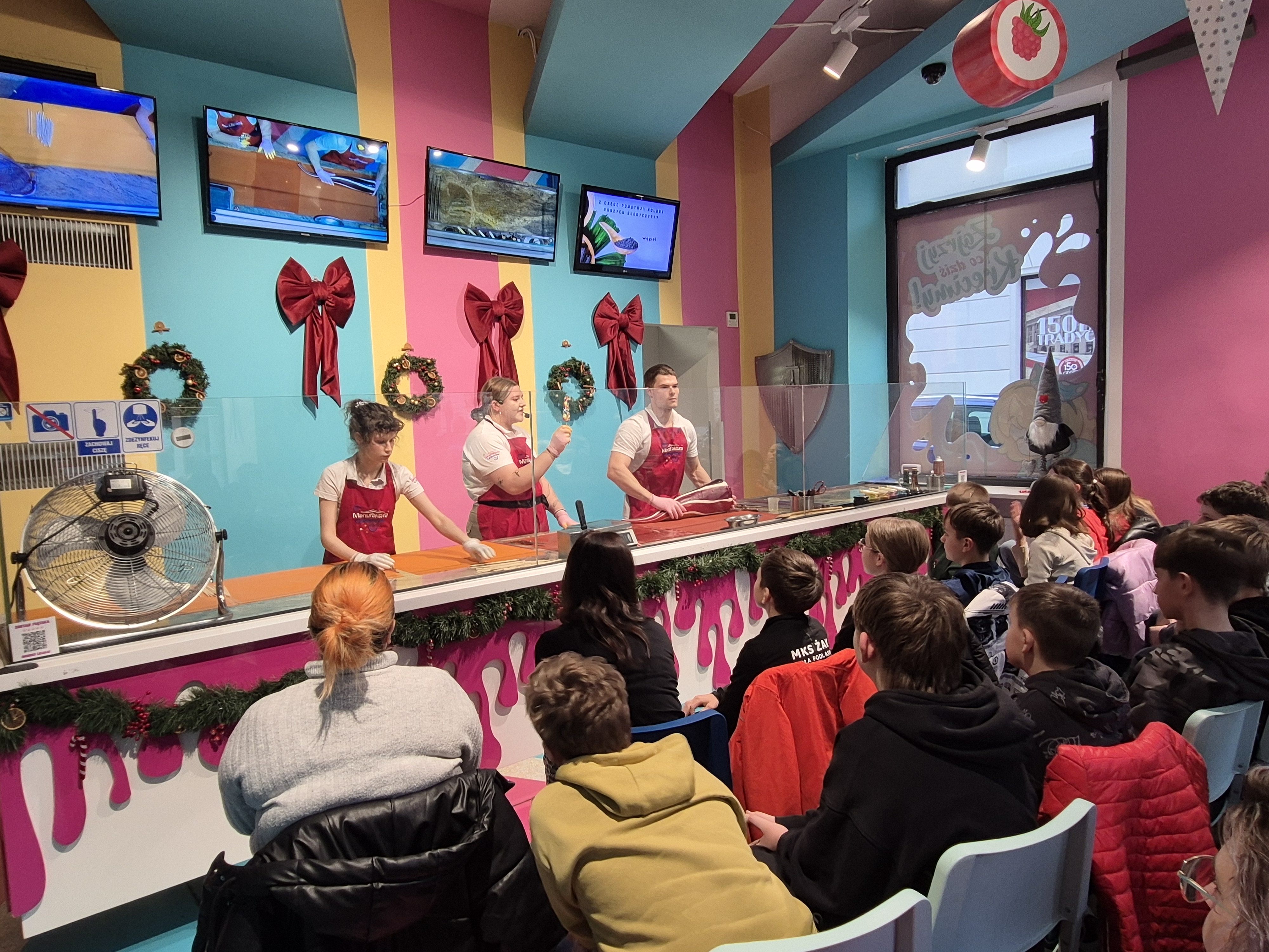 Kolejnym etapem wycieczki były warsztaty w manufakturze cukierków. Podczas zajęć uczniowie obserwowali proces powstawania słodyczy – od rozgrzewania masy cukrowej, przez barwienie i formowanie, aż do tworzenia gotowych cukierków o fantazyjnych kształtach. Każdy uczestnik mógł także spróbować swoich sił w samodzielnym skręcaniu kolorowych lizaków w kształcie choinki, co dostarczyło wielu uśmiechów i radości.