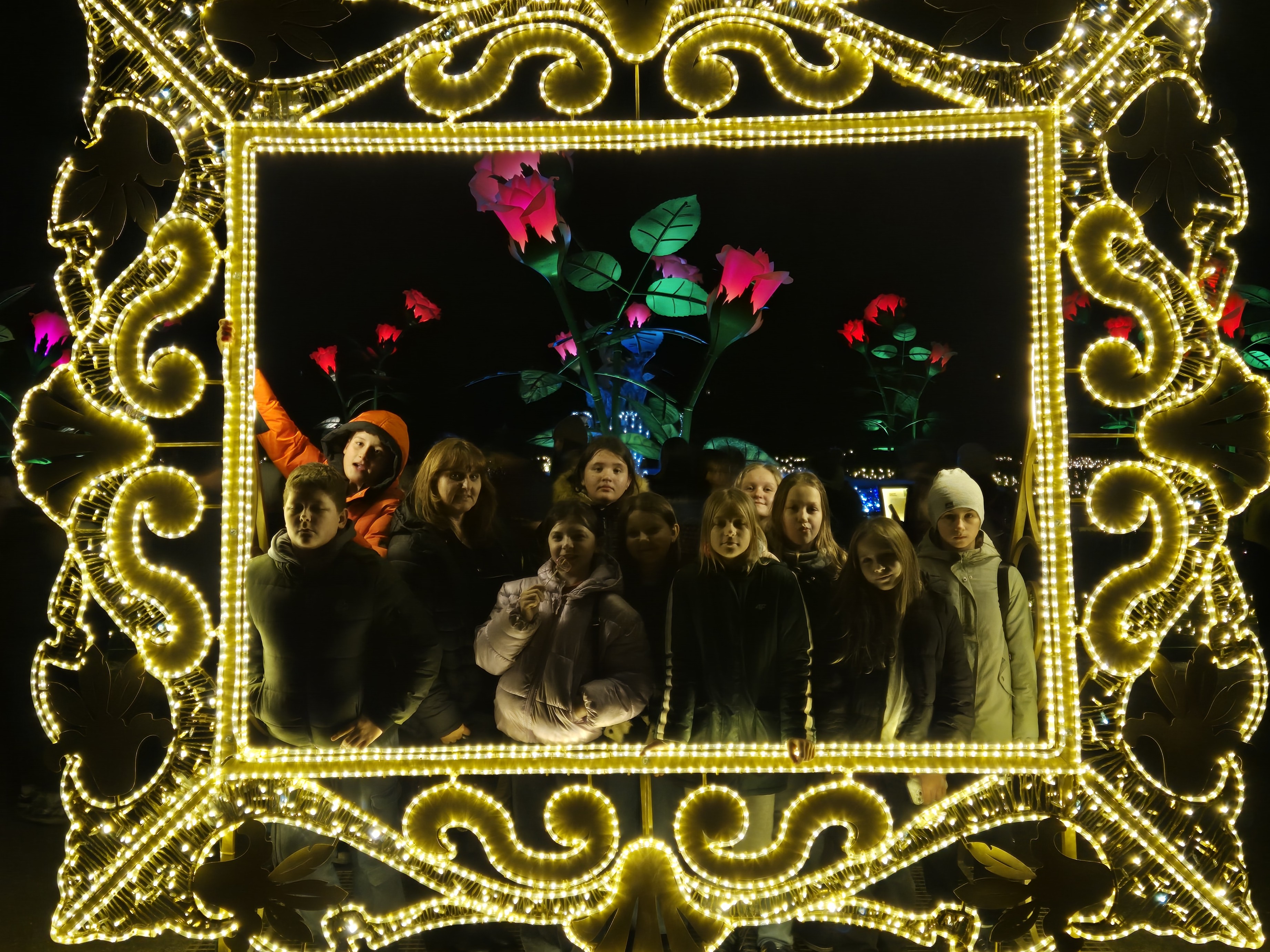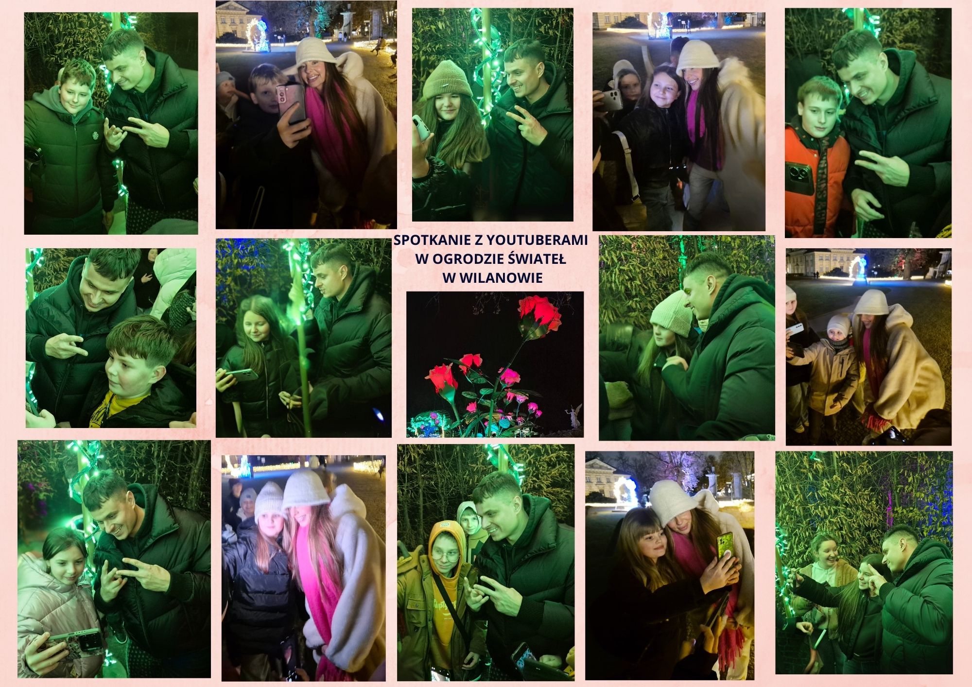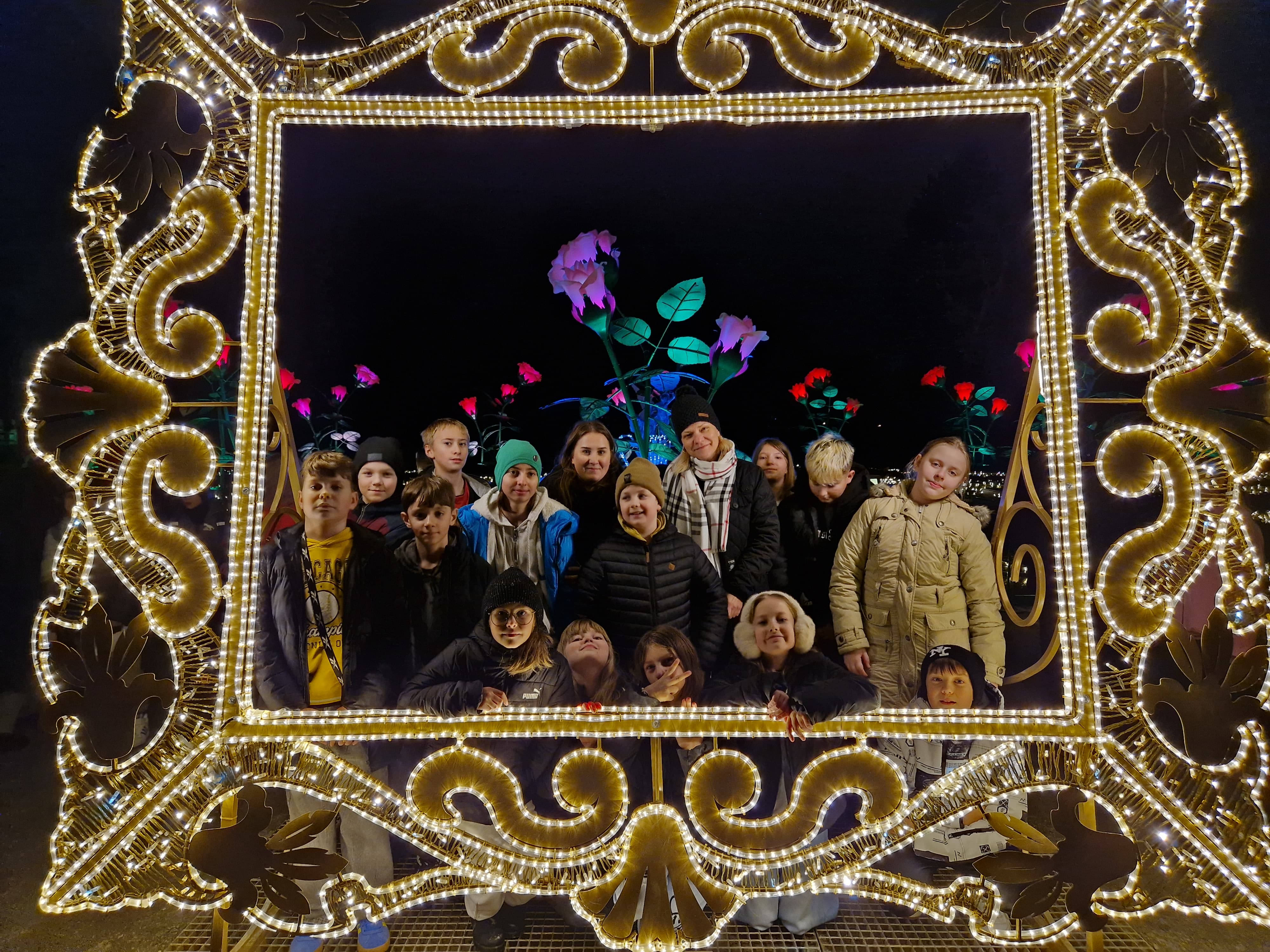 Ostatnim punktem programu okazał się Ogród Świateł w Wilanowie. Po zmroku park zamienił się w bajkową krainę pełną iluminacji i świetlnych instalacji. Uczniowie spacerowali alejkami, podziwiając kolorowe dekoracje, tunel świetlny oraz świetlne przedstawienia inspirowane historią i kulturą. Dodatkową atrakcją było spotkanie znanych uczniom youtuberów, z którymi chętnie rozmawiali, robili pamiątkowe zdjęcia oraz przekazywali pozdrowienia. Magiczna atmosfera miejsca zrobiła ogromne wrażenie na wszystkich uczestnikach.