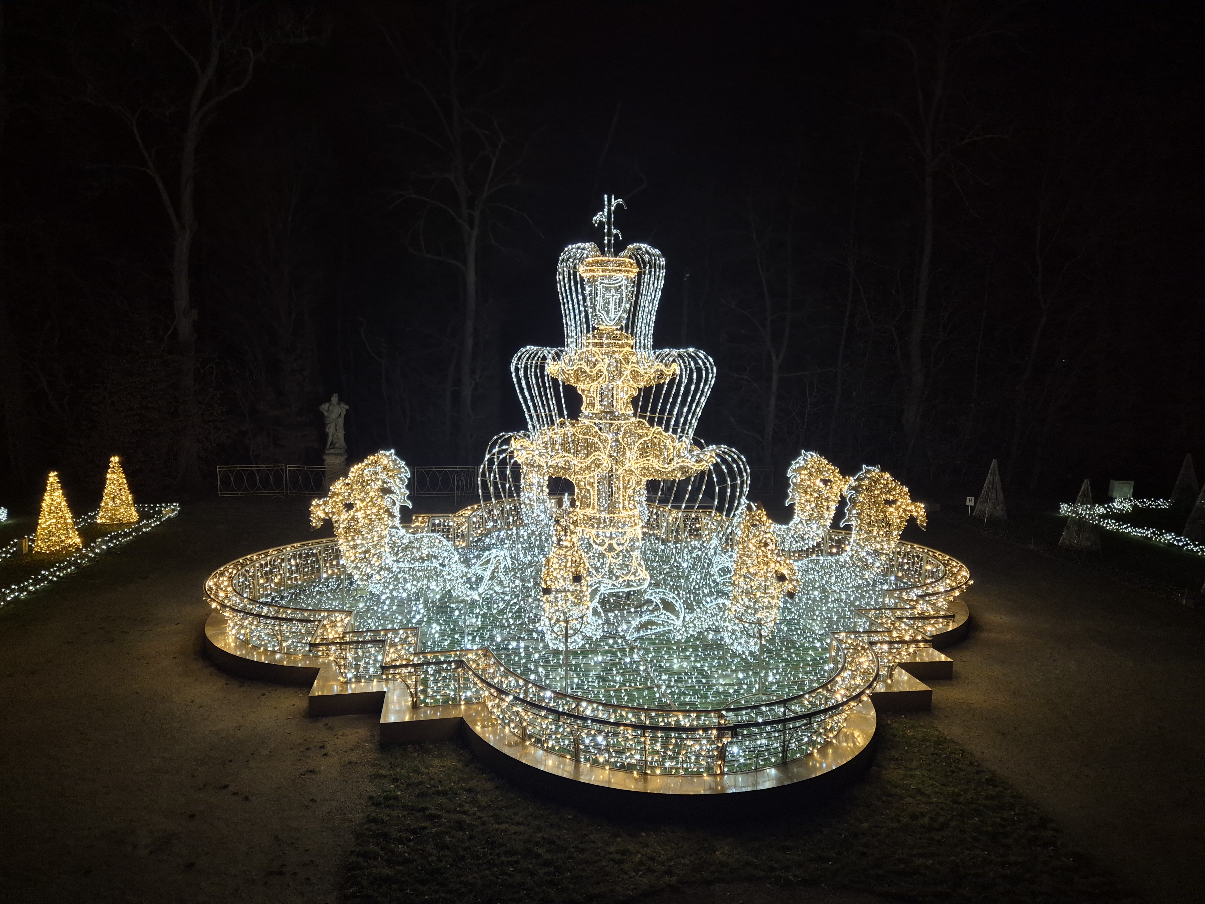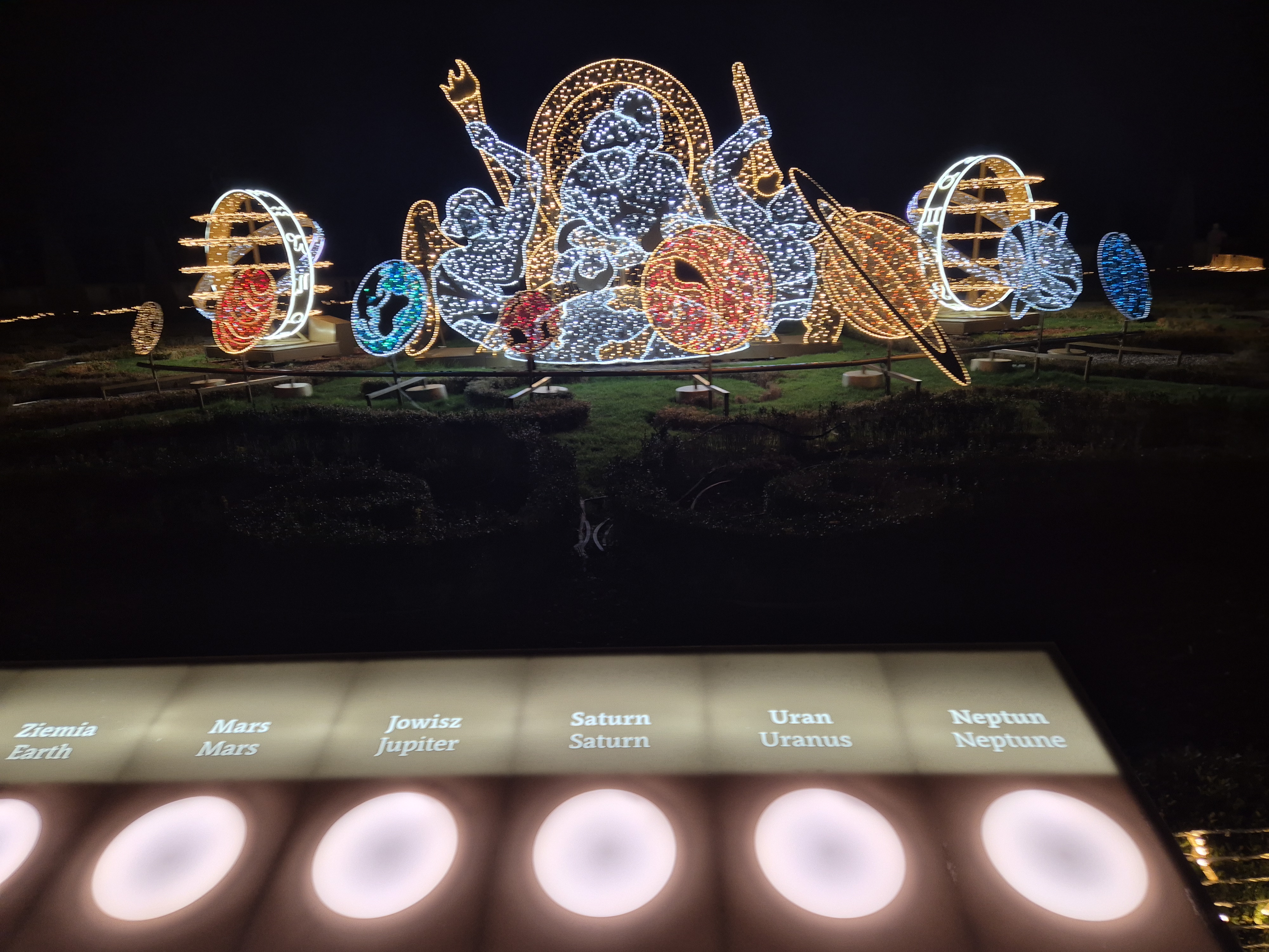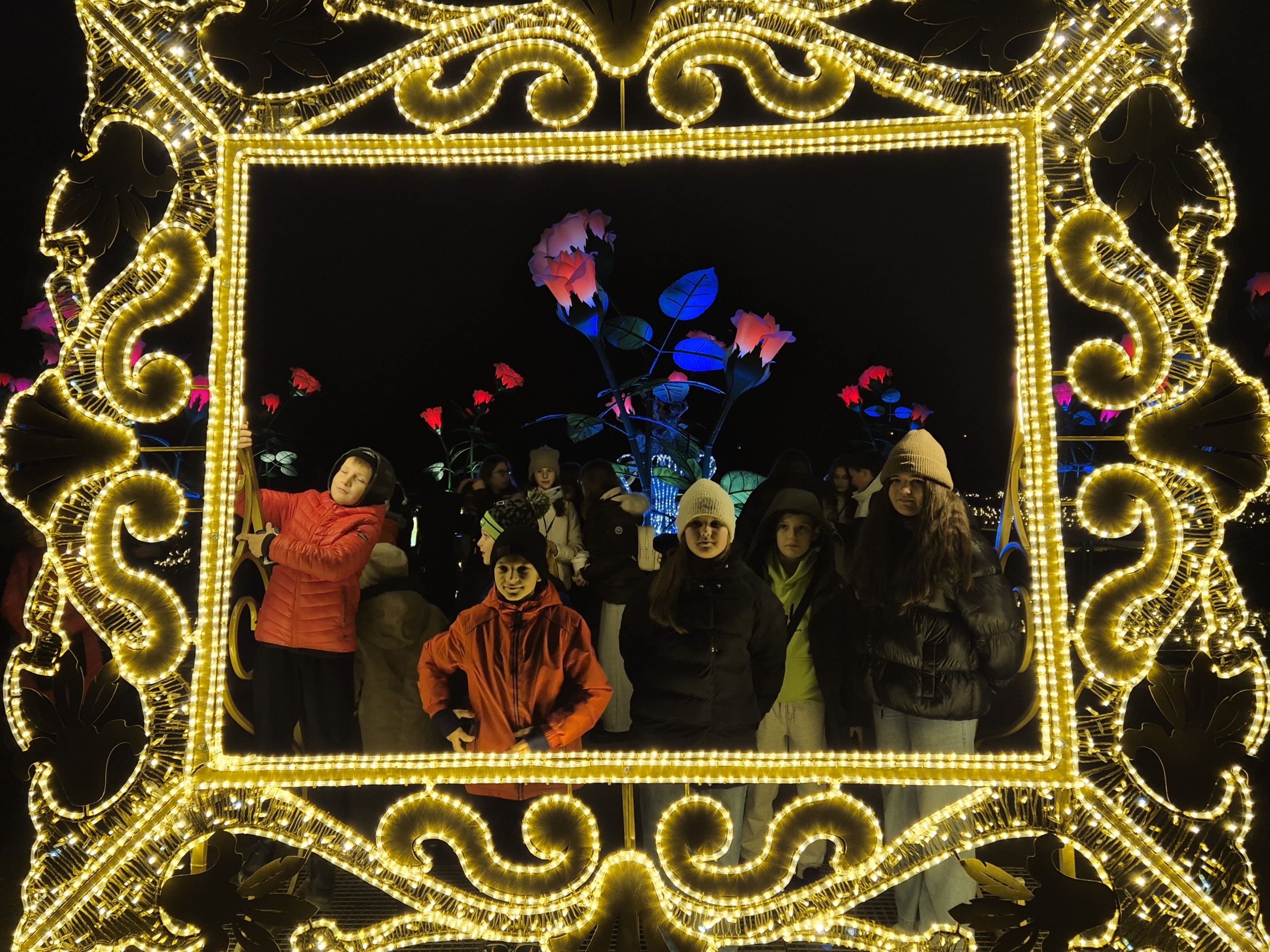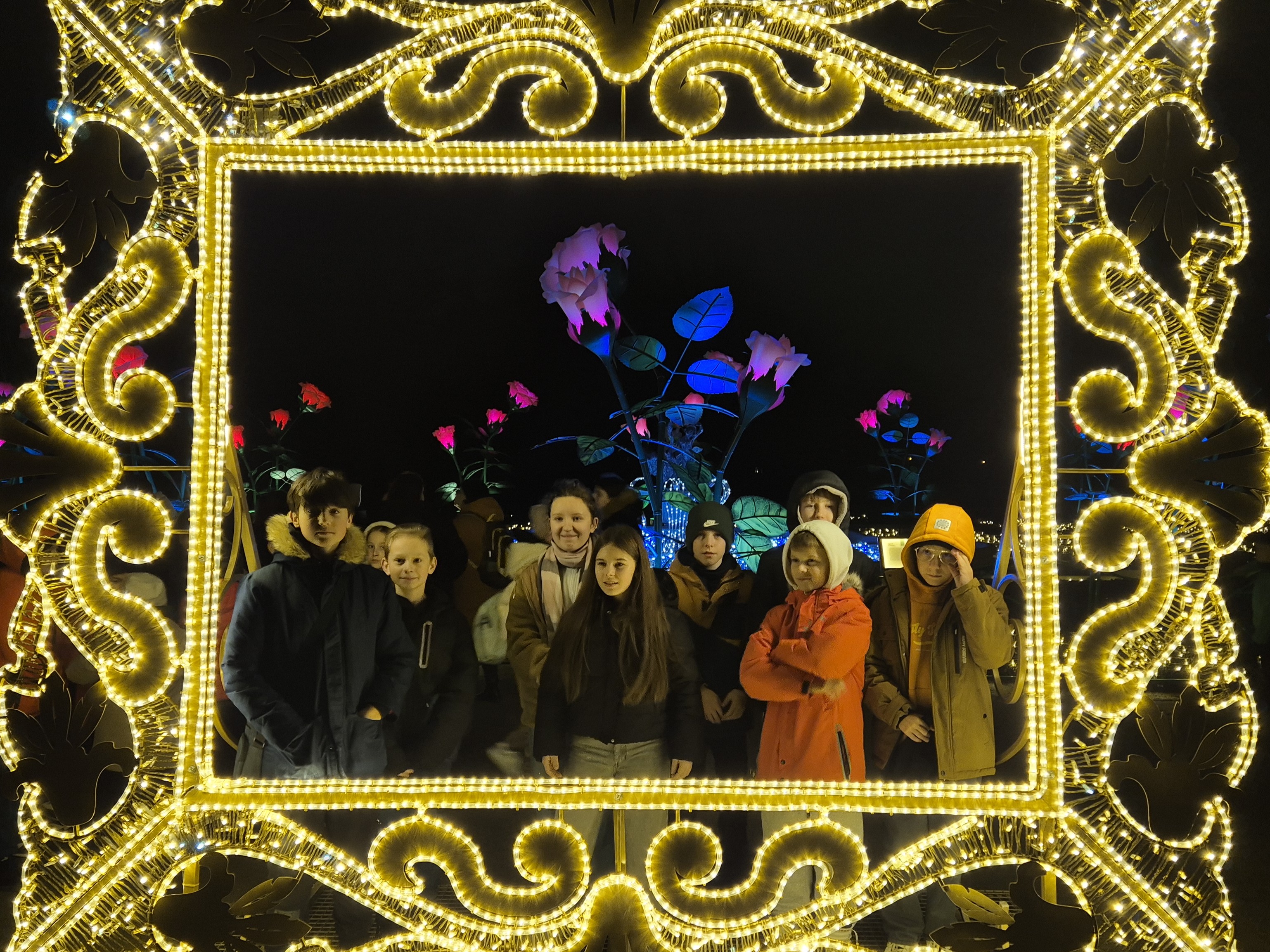 Ostatnim punktem programu okazał się Ogród Świateł w Wilanowie. Po zmroku park zamienił się w bajkową krainę pełną iluminacji i świetlnych instalacji. Uczniowie spacerowali alejkami, podziwiając kolorowe dekoracje, tunel świetlny oraz świetlne przedstawienia inspirowane historią i kulturą. Dodatkową atrakcją było spotkanie znanych uczniom youtuberów, z którymi chętnie rozmawiali, robili pamiątkowe zdjęcia oraz przekazywali pozdrowienia. Magiczna atmosfera miejsca zrobiła ogromne wrażenie na wszystkich uczestnikach.