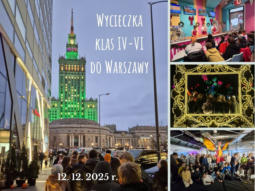W piątek, 12 grudnia 2025 r., uczniowie klas 4–6 wyruszyli na pełną wrażeń wycieczkę do Warszawy. Wyjazd miał na celu nie tylko poznanie interesujących atrakcji stolicy i udział w kreatywnych zajęciach, lecz także integrację uczniów oraz możliwość lepszego poznania się w mniej formalnej atmosferze – poza szkolnymi ławkami, również z nauczycielami. Wspólne podróżowanie, rozmowy i zabawa sprzyjały budowaniu pozytywnych relacji i wzmacnianiu więzi między uczestnikami.